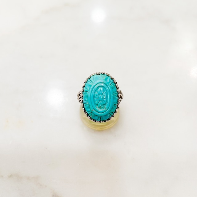 ターコイズは夏の強い陽の光にも負けない不思議な華やかさの青が美しい天然石です。 このリングに使われているターコイズは花模様の彫りが施されているのでさらに個性的な雰囲気です。 石自体がとても古いもので長い時を超えてきたものになります。 その不思議な魅力のあるターコイズを繊細な飾り爪で取り囲みました。 施されている花模様の花びらの繊細な線とマッチする、それ自体が飾りとなってくれる爪です。 台には葡萄の柄を施しています。 遠い時代から大切にされてきた葡萄というモチーフと、長い時を超えてきたターコイズの雰囲気がとても良くマッチ。 燻されたシルバーによって台や飾り爪の細工もよりハッキリと浮かんでいます。 ターコイズの大きさは21×16mmほど。 しっかり目の大きさなので、付け映えのするリングとなっています。 どんな色のお洒落の中でもパッと目を惹くターコイズブルーの華やかさ。 一年を通してお洒落全体を華やかに彩ってくれるリングです。 備考欄にてご希望のサイズをお知らせください。 ピタッとつけたい方には細い金属のリングと同じ大きさ。 少しゆったり目に付けたい方には細い金属の指輪より一号上の大きさがお勧めです。 サイズ直し等が必要な場合には2.3週間ほどお時間を頂く場合もございます。 また18号からはお値段が変わりますので、18号以上をご希望の方はオプションをお選びください。 こちらの商品はカードの不正利用防止のため発送までにお時間をいただく場合もございます。 ご了承くださいませ。