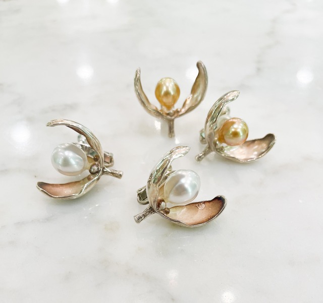 ヨーロッパではクリスマスになると飾りとなって登場してくるヤドリギを、シルバーと南洋ゴールドパールでイヤリングにしてみました。 Yのような形のヤドリギの枝と葉。 その真ん中に美しく輝くのは南洋真珠。 丸ではなく形が面白いバロックパールを使うことで、より自然に近い雰囲気がでています。 横から見てみると、イヤリングの金具とヤドリギの枝の部分の間が少し空いているので、マスクの紐の邪魔もしません。 ヤドリギはクリスマスシーズンにはぴったりのモチーフ! でもこのしっかりとしたつくりのイヤリングは、それ以外の季節にも楽しく使っていただけます。 せっかくならブローチとセットがお勧めです。 こちらのイヤリングはカードの不正利用防止のため発送までにお日にちをいただく場合がございます。 ご了承くださいませ。
