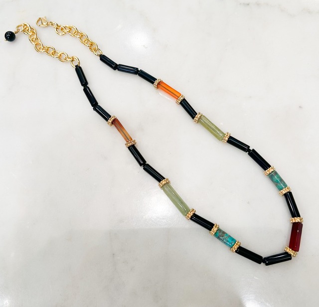 細長い天然石ビーズと金色パーツのネックレス