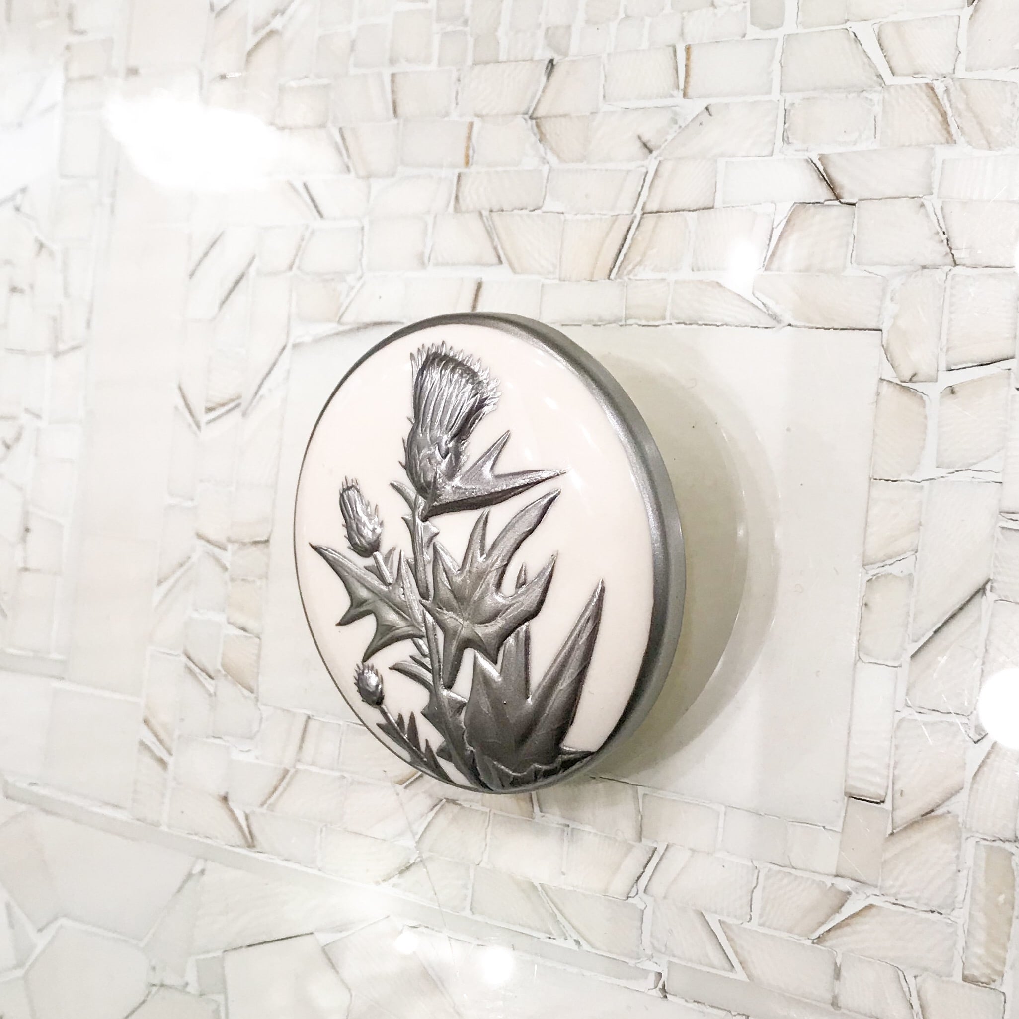 象牙色のやわらかな白の上に、スッと咲く銀色のアザミ。