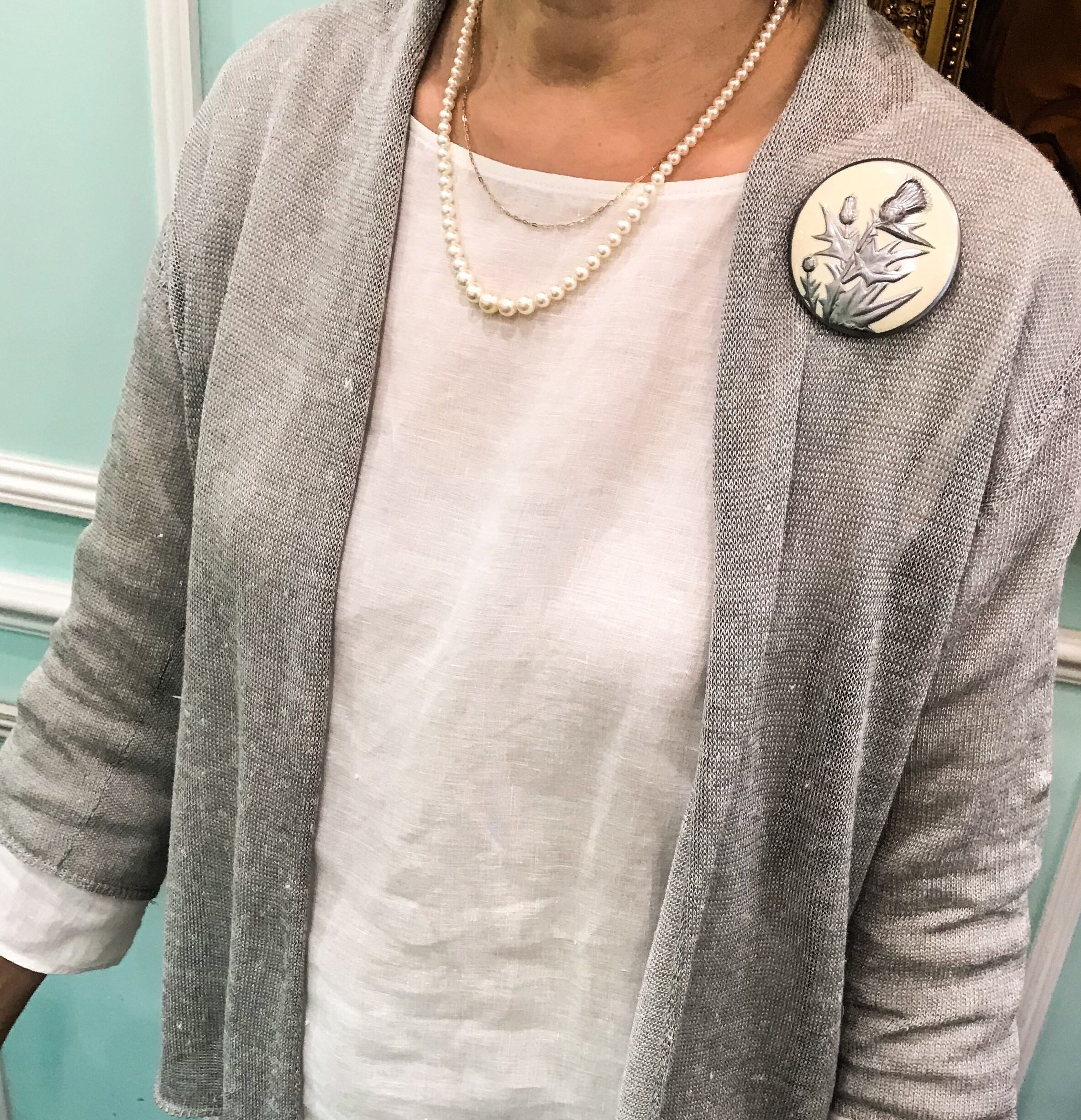 少し厚みのある象牙色の樹脂に、高蒔絵のようにしっかりと盛り上げた、銀彩のアザミのブローチです。