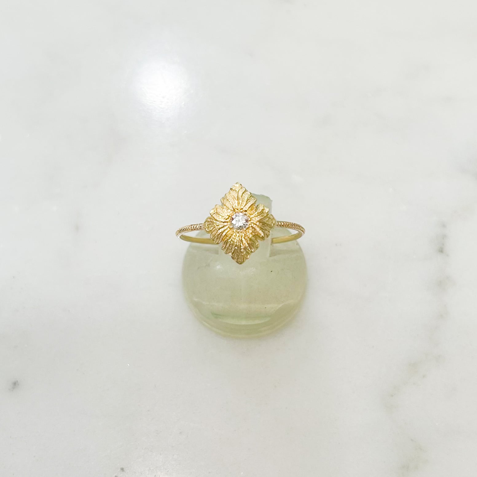 真ん中に小さなダイヤモンドを配し、四方に広がるような彫りが施しているとても繊細なデザインです。