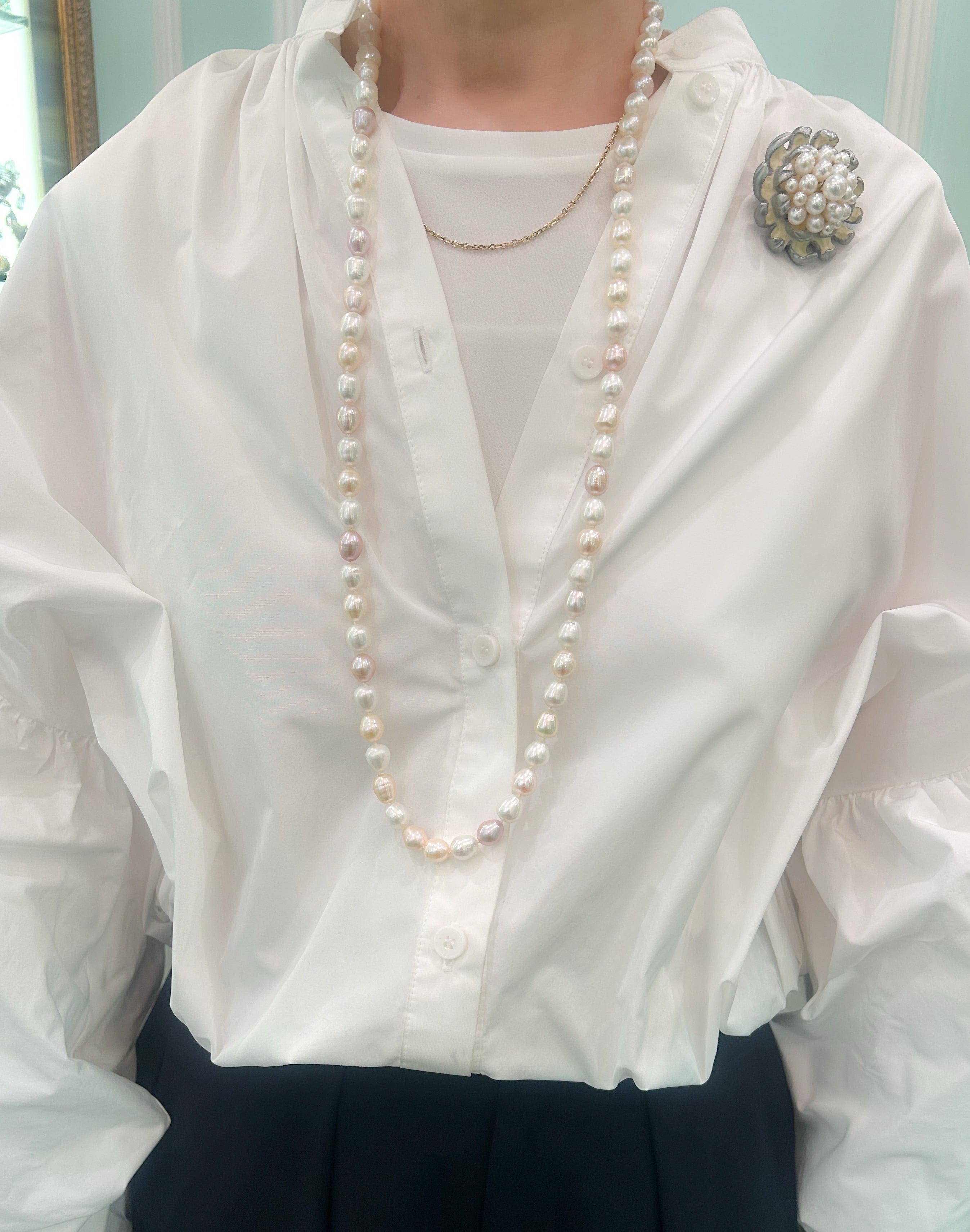 パールの間には全て結び目を入れて繋いでいるので、つけた時には滑らかに沿うようにつけることができます。