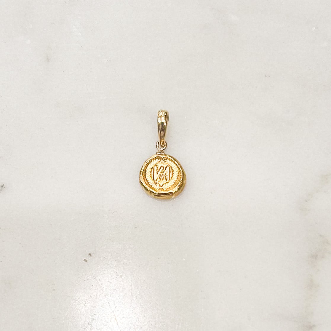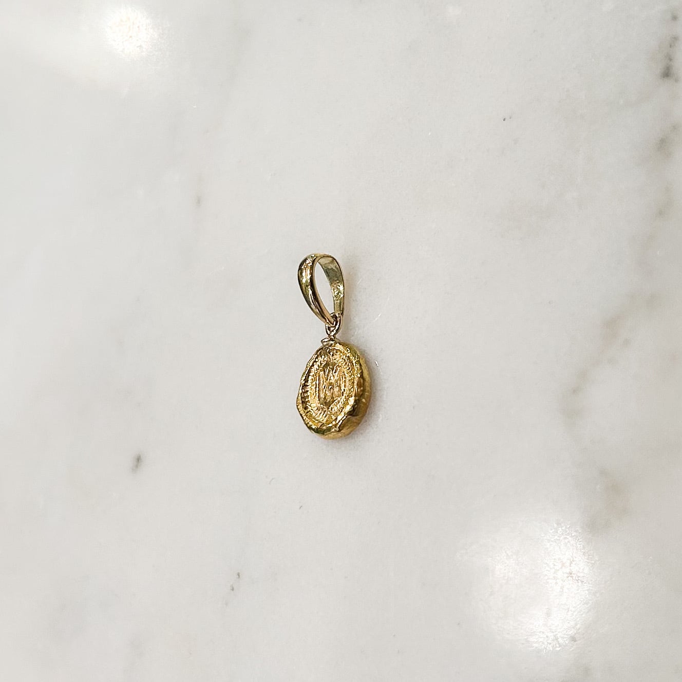 24金を溶かして、ポトっと丸く落とした上から刻印をギュッと押して作ったものに、チェーンを通す18金のカンを付けたペンダントです。