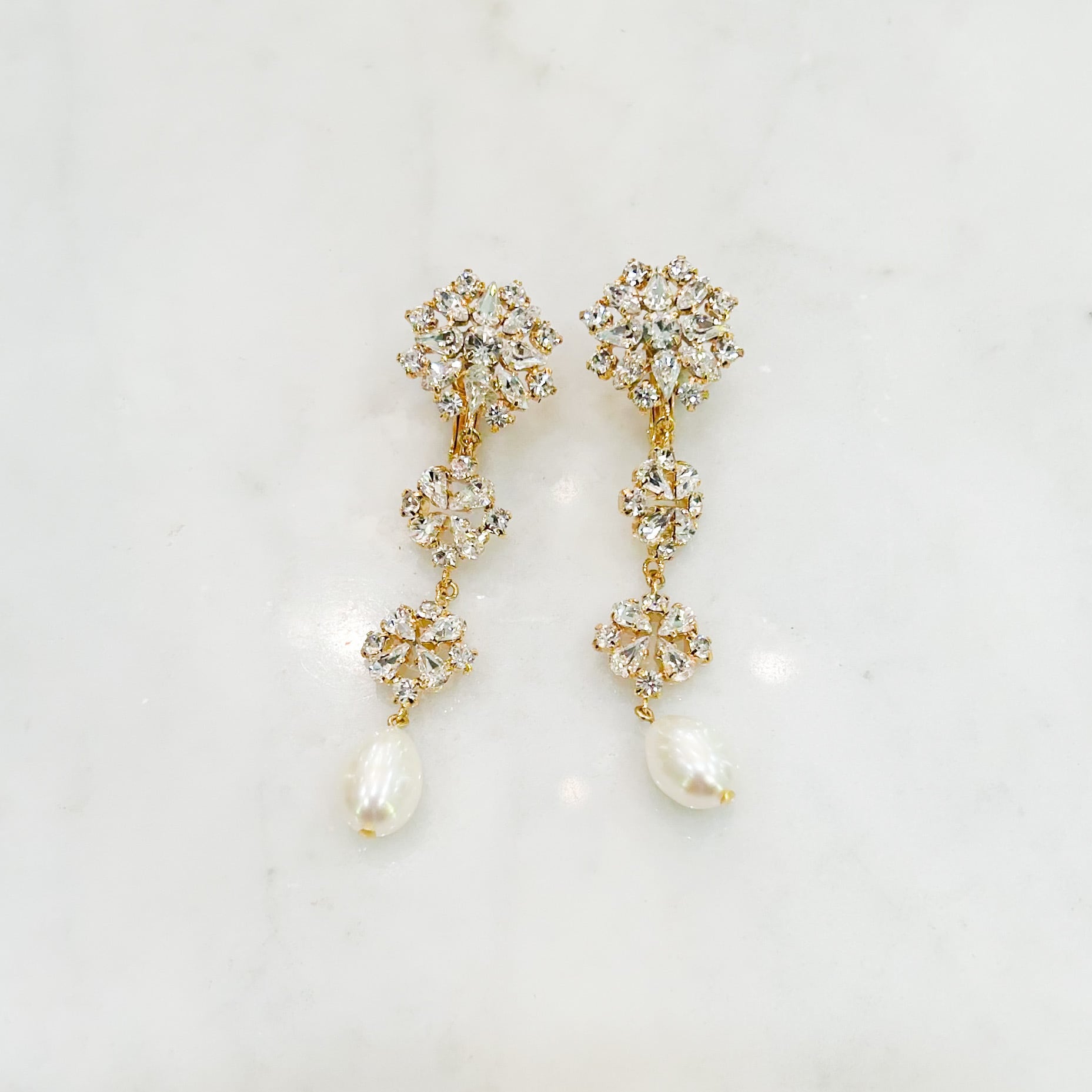 小さめのラウンド、マーキス、ペアシェイプのラインストーンを組み合わせして、3つのパーツを作って繋いで、ユラユラと耳元で揺れるイヤリングにしています。