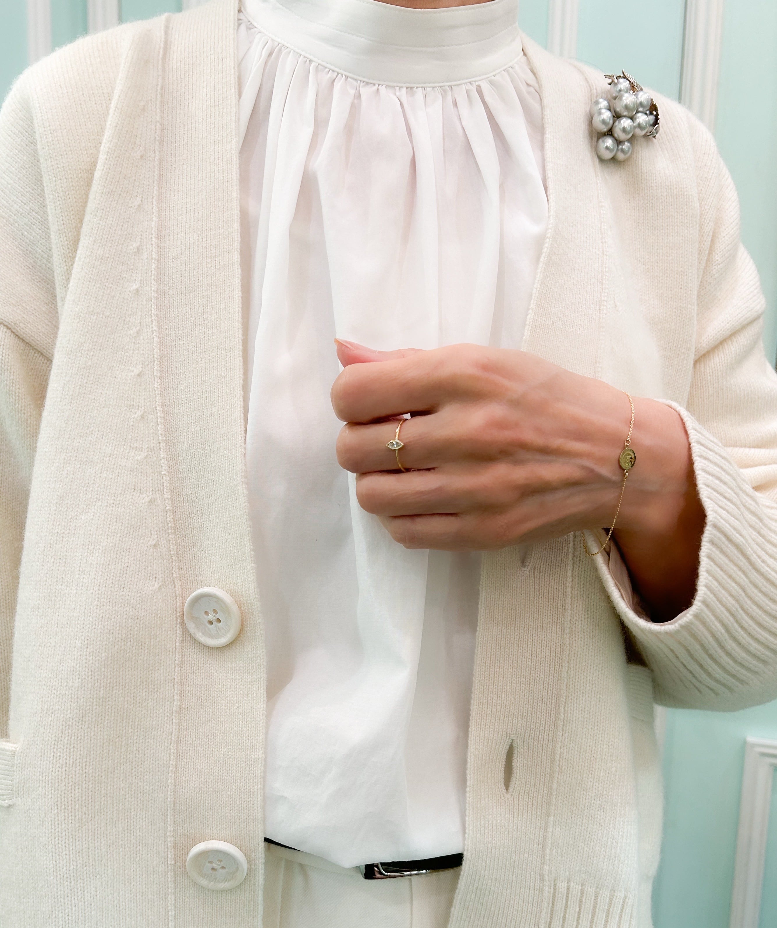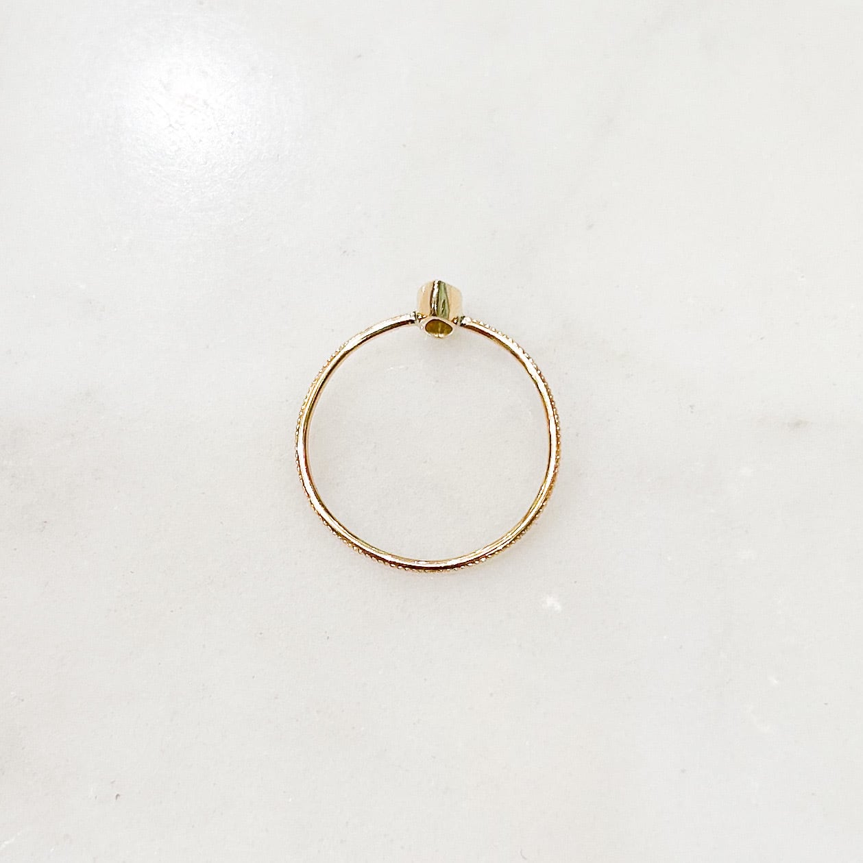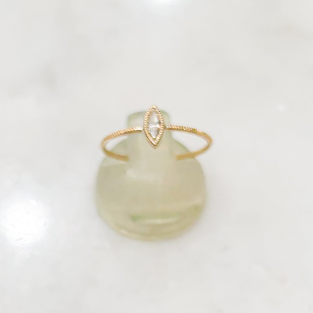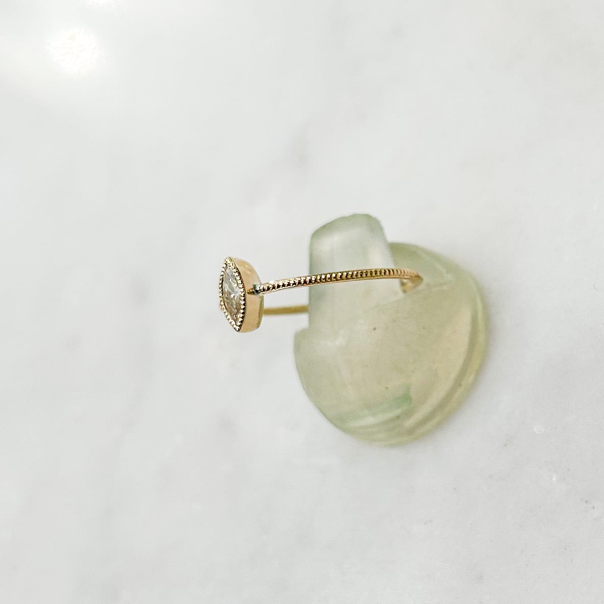 幅が1mmの18金の線に18金で覆輪されたマーキス型の小さなダイヤモンドを載せています。
