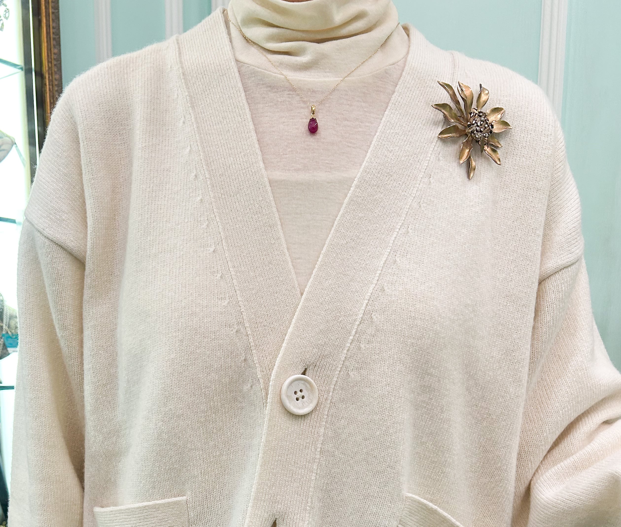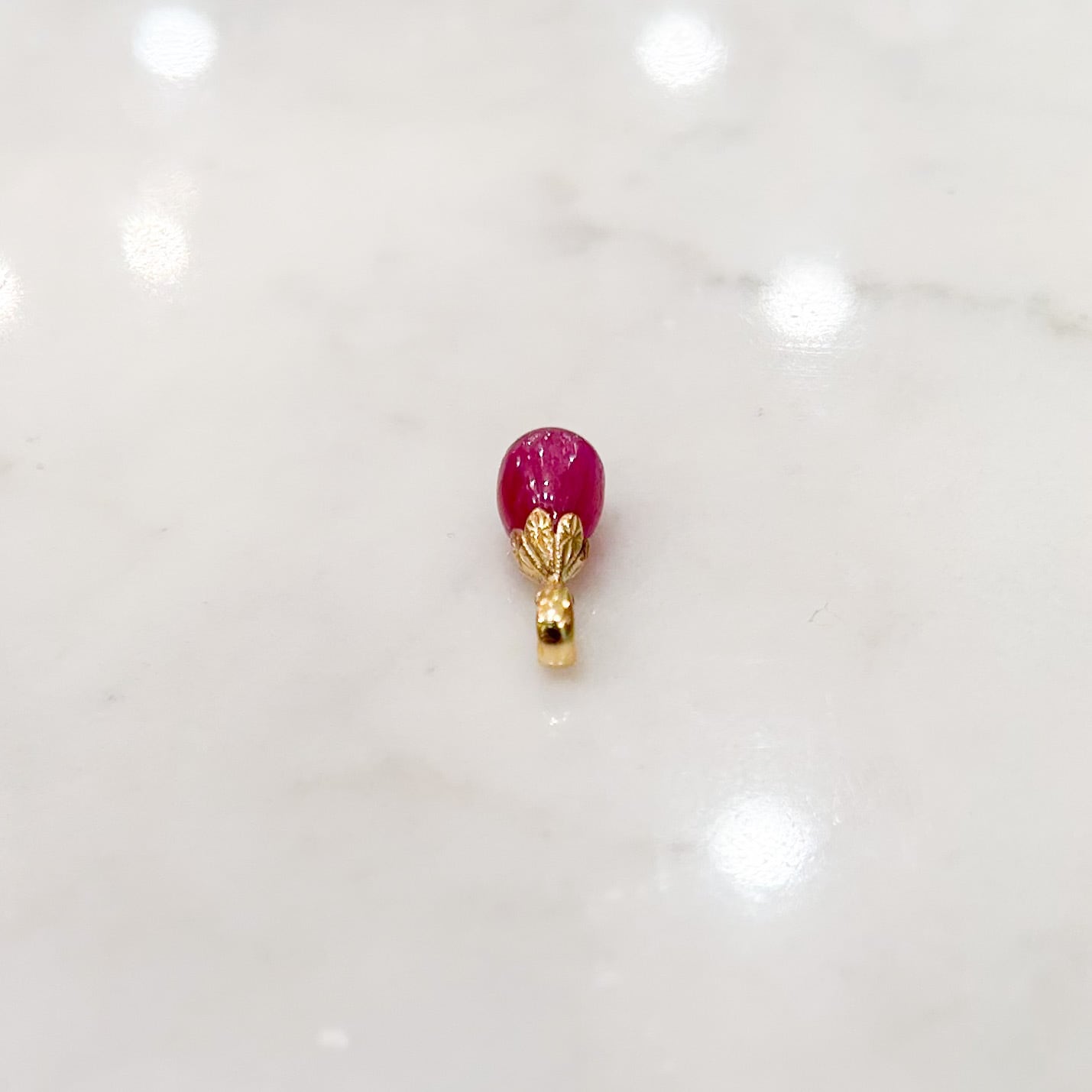 胸元にストンと落ち着くしずく型のルビーの上部にはナスのヘタのような形の金具が取り付けられています。