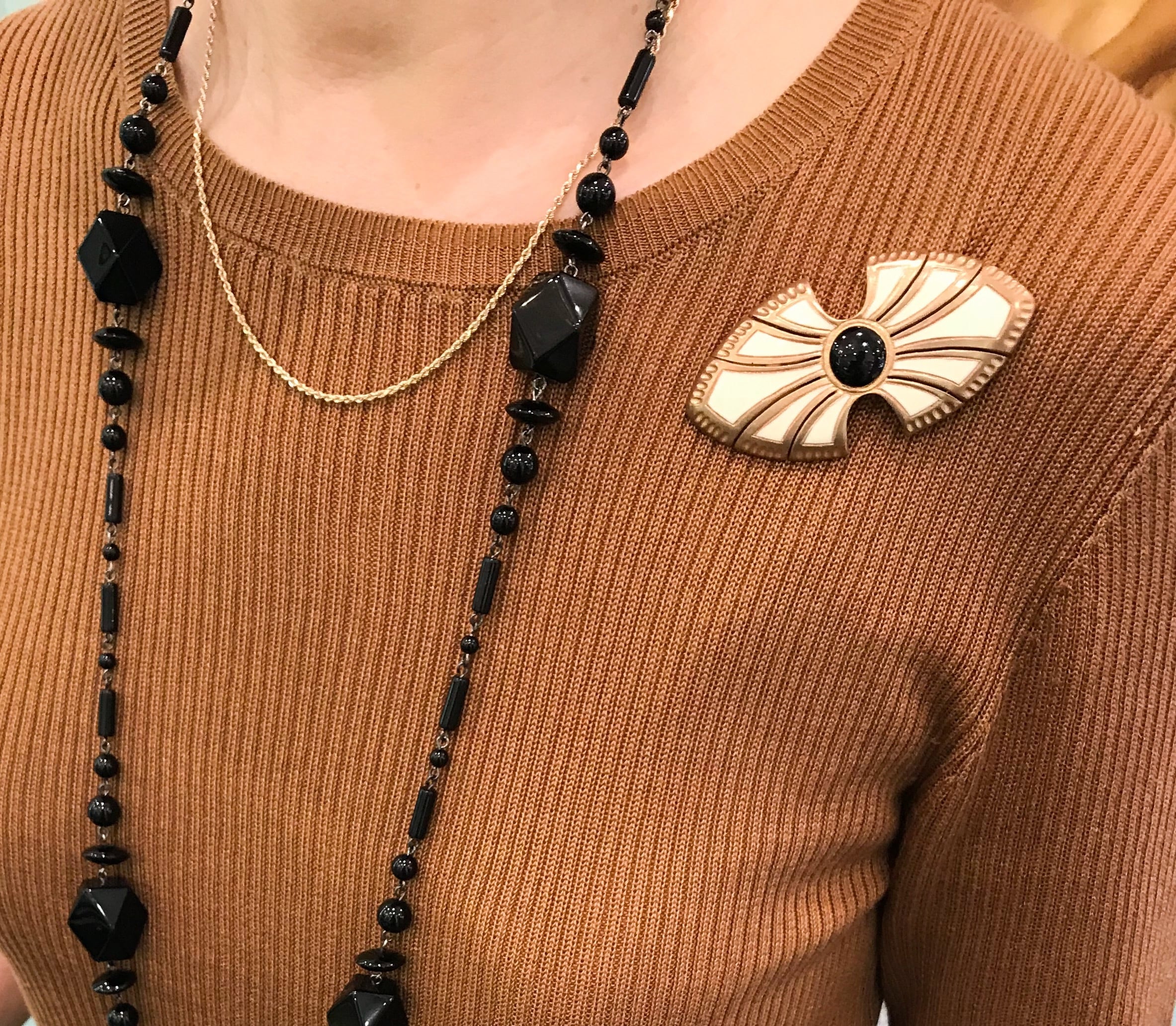象牙色の樹脂に、黒漆と、同じく漆を使った技法である金彩とをかけた、流れるような形が綺麗なブローチです。