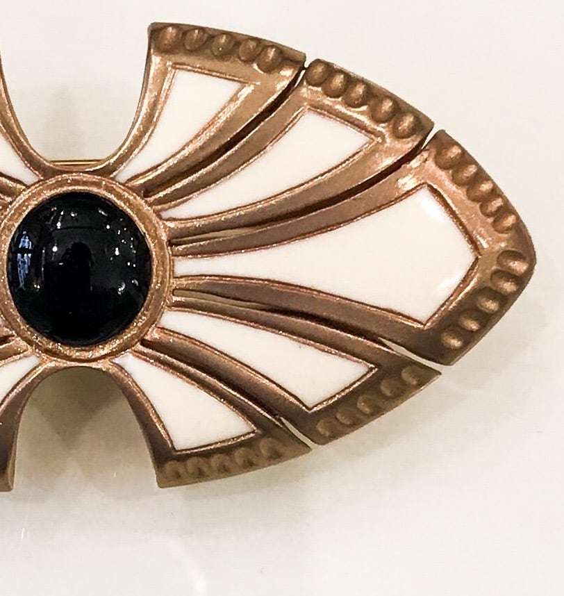 象牙色の樹脂に金彩・黒漆、流線型のブローチ