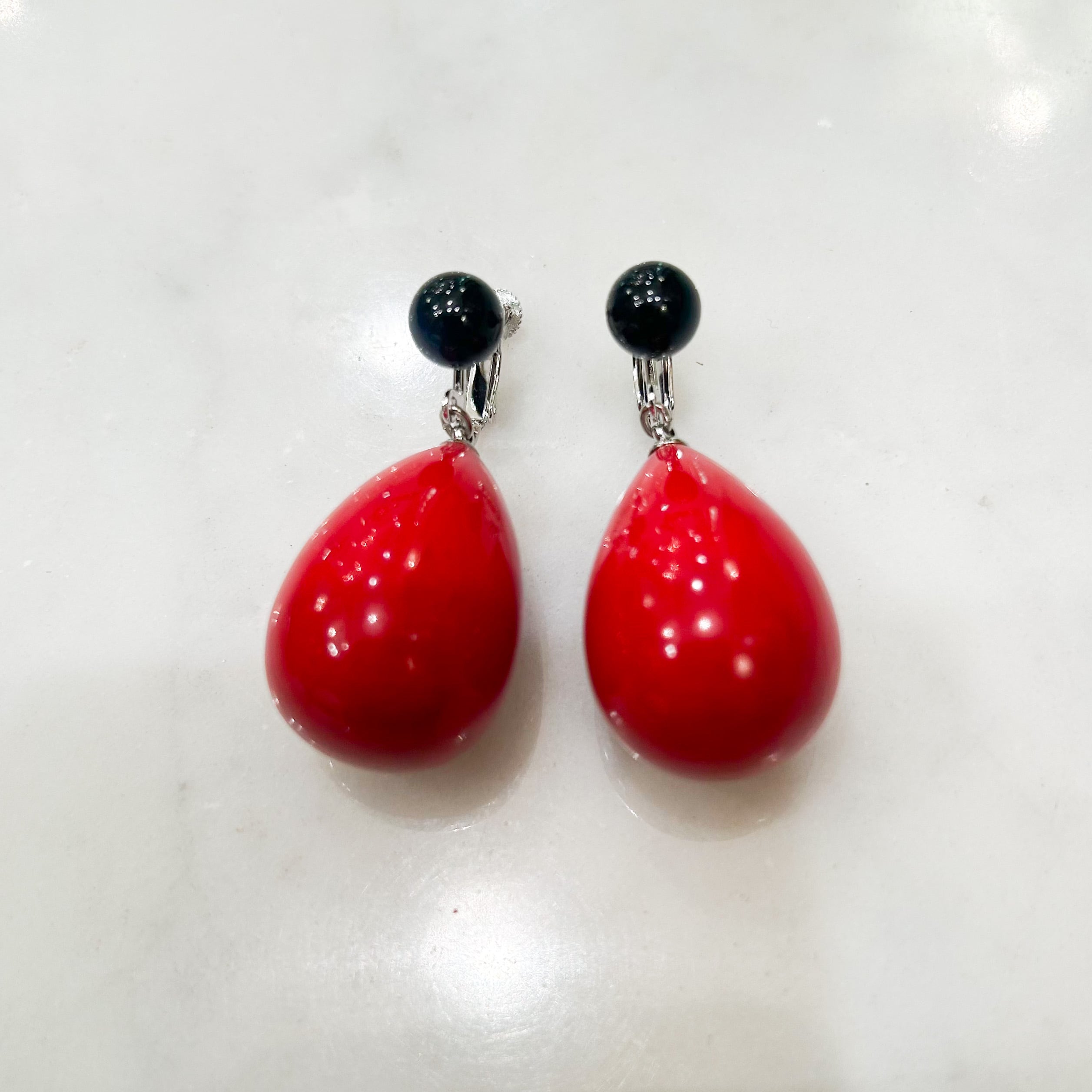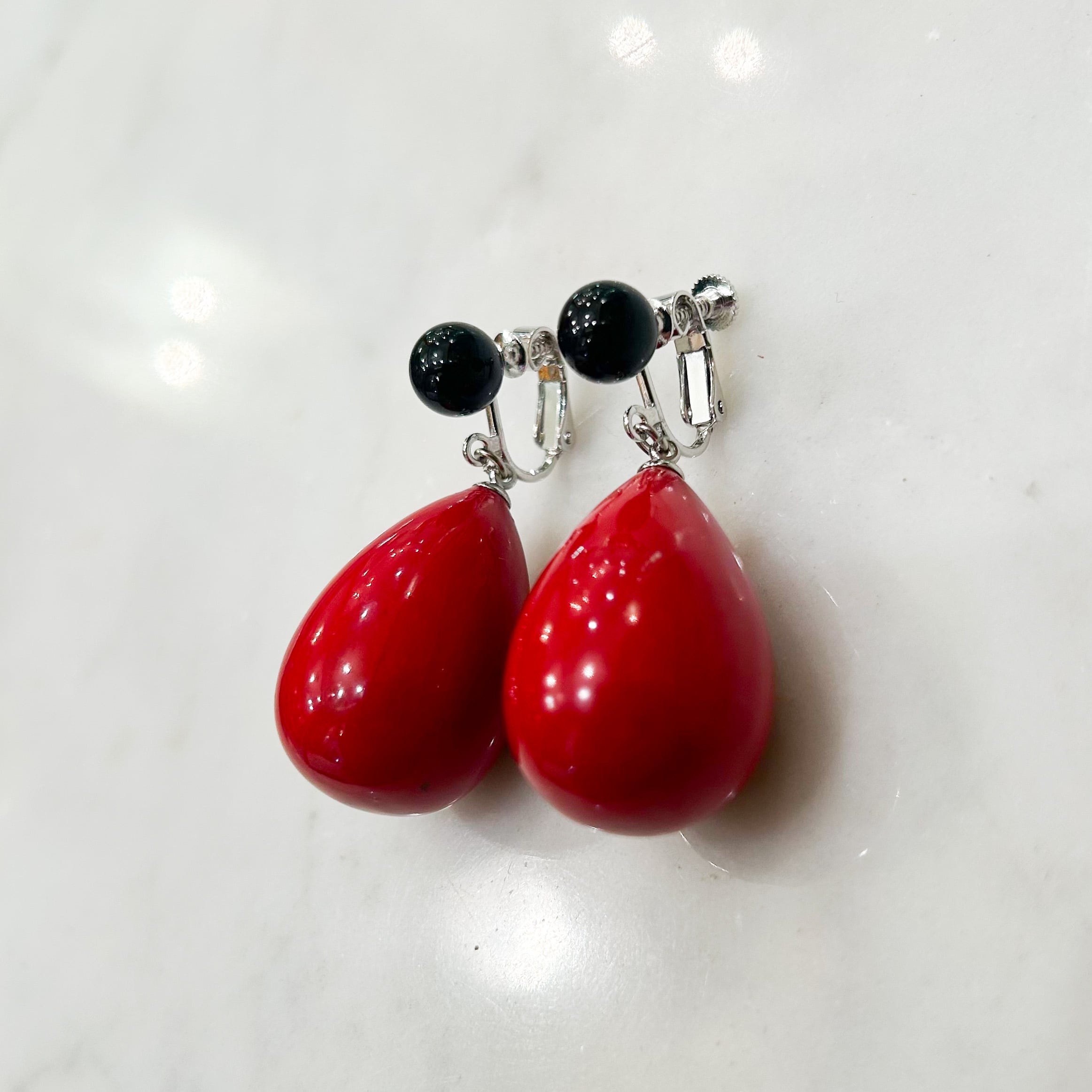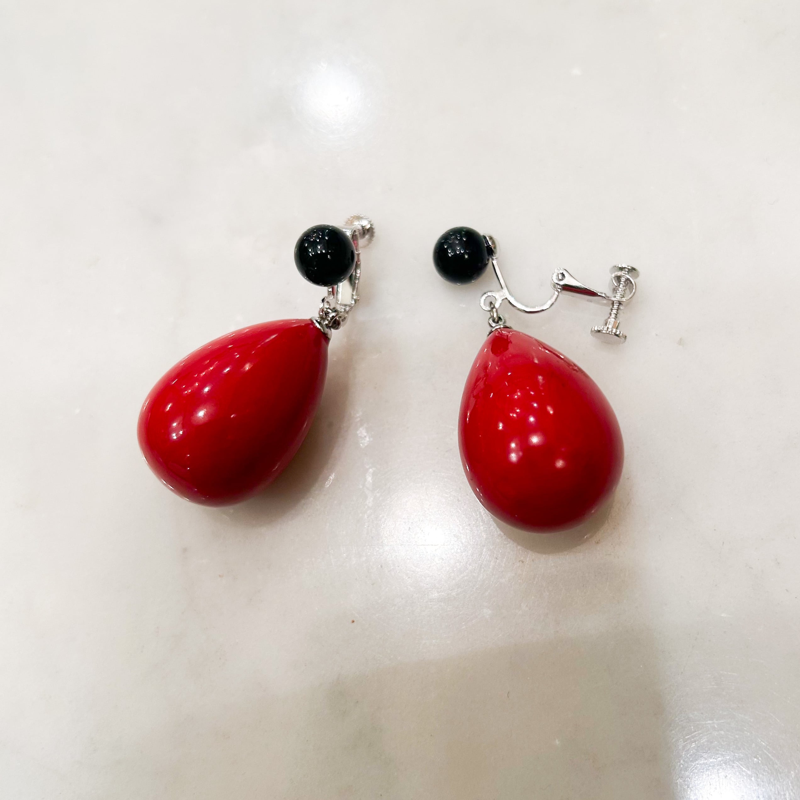 丸いオニキスの下にしずく型のポプラ材に赤漆を施したパーツが揺れるイヤリング