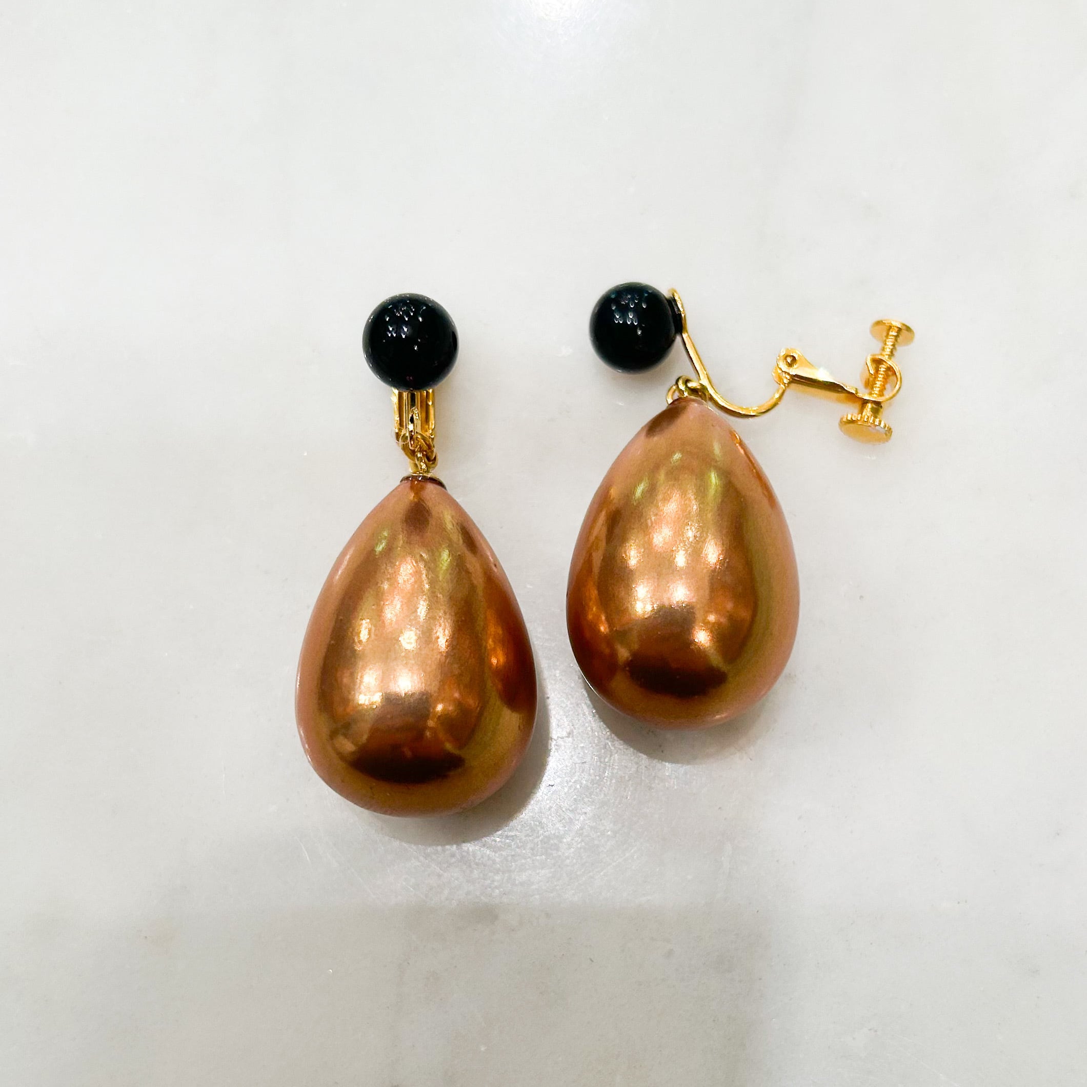 まん丸な8mmのオニキスの下に、軽量なポプラで作ったしずく型に金彩を全面にかけたパーツをぶら下げた、大きさのしっかりとしたイヤリングです。
