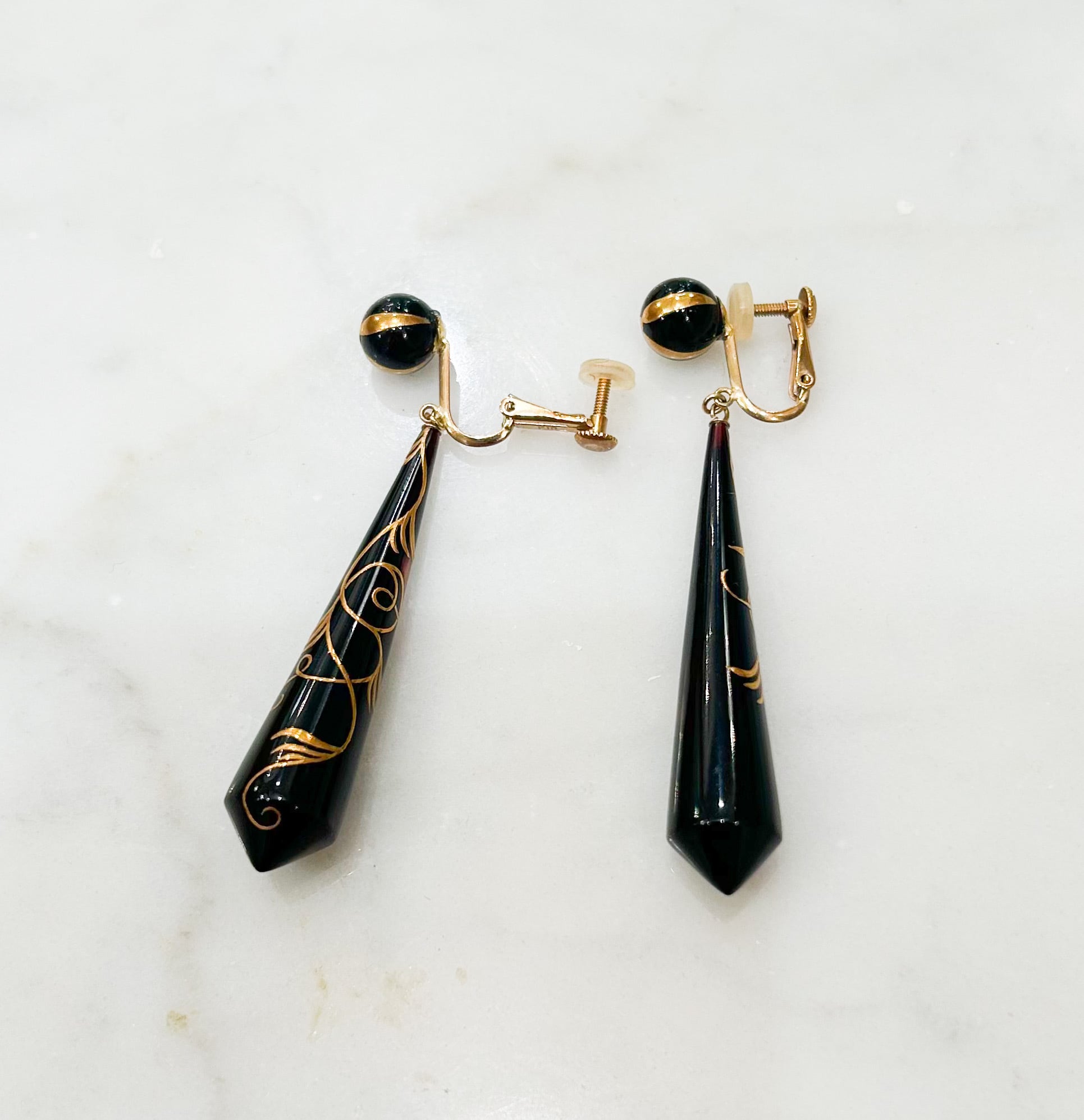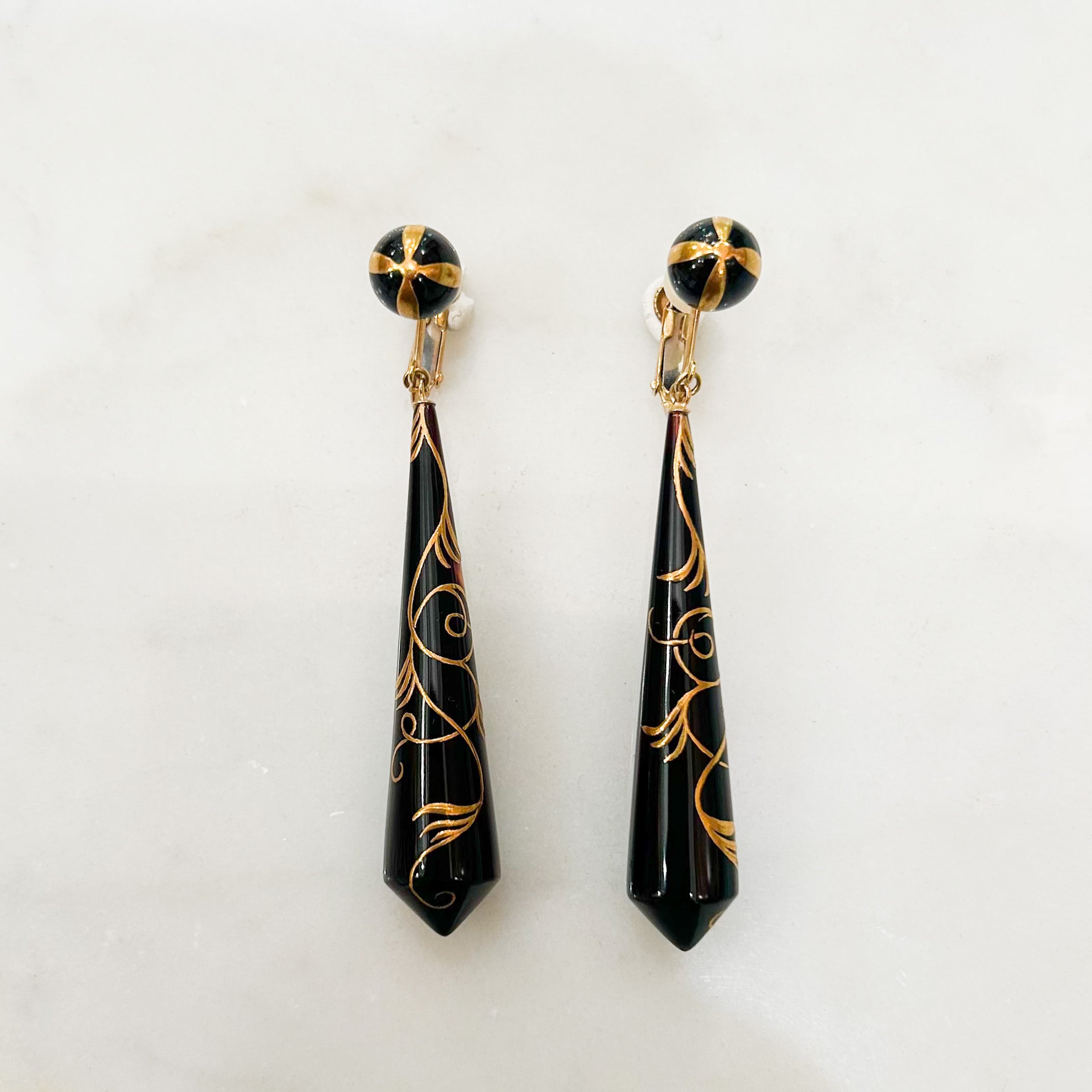 金蒔絵を施した丸玉のべっ甲下に植物模様を描いた円錐系のべっ甲が揺れるイヤリング