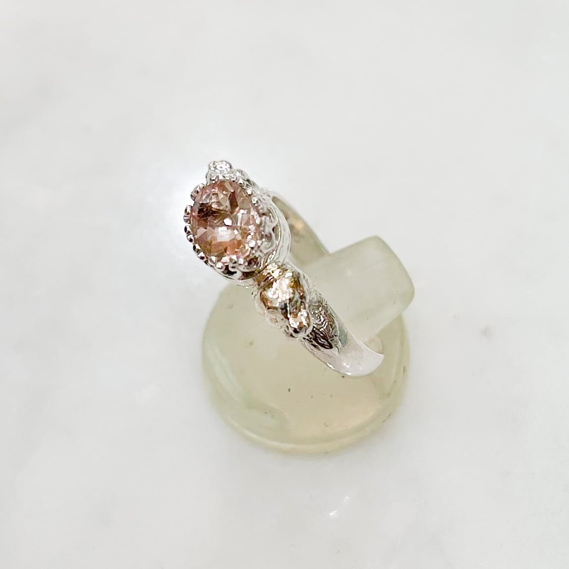 上から見るとクンツァイトの繊細な美しさを、横から見てみると王冠をライオンが守っているかのようなデザインを楽しめるリングです。