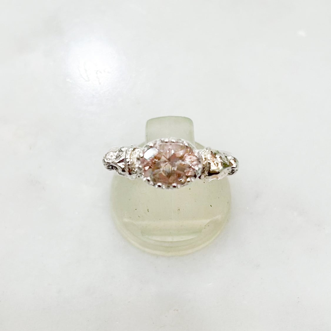 楕円形のクンツァイトを繊細な飾り爪で取り巻いて、外側に向かってライオンの顔がデザインされたシルバーリングに横向きにセット。