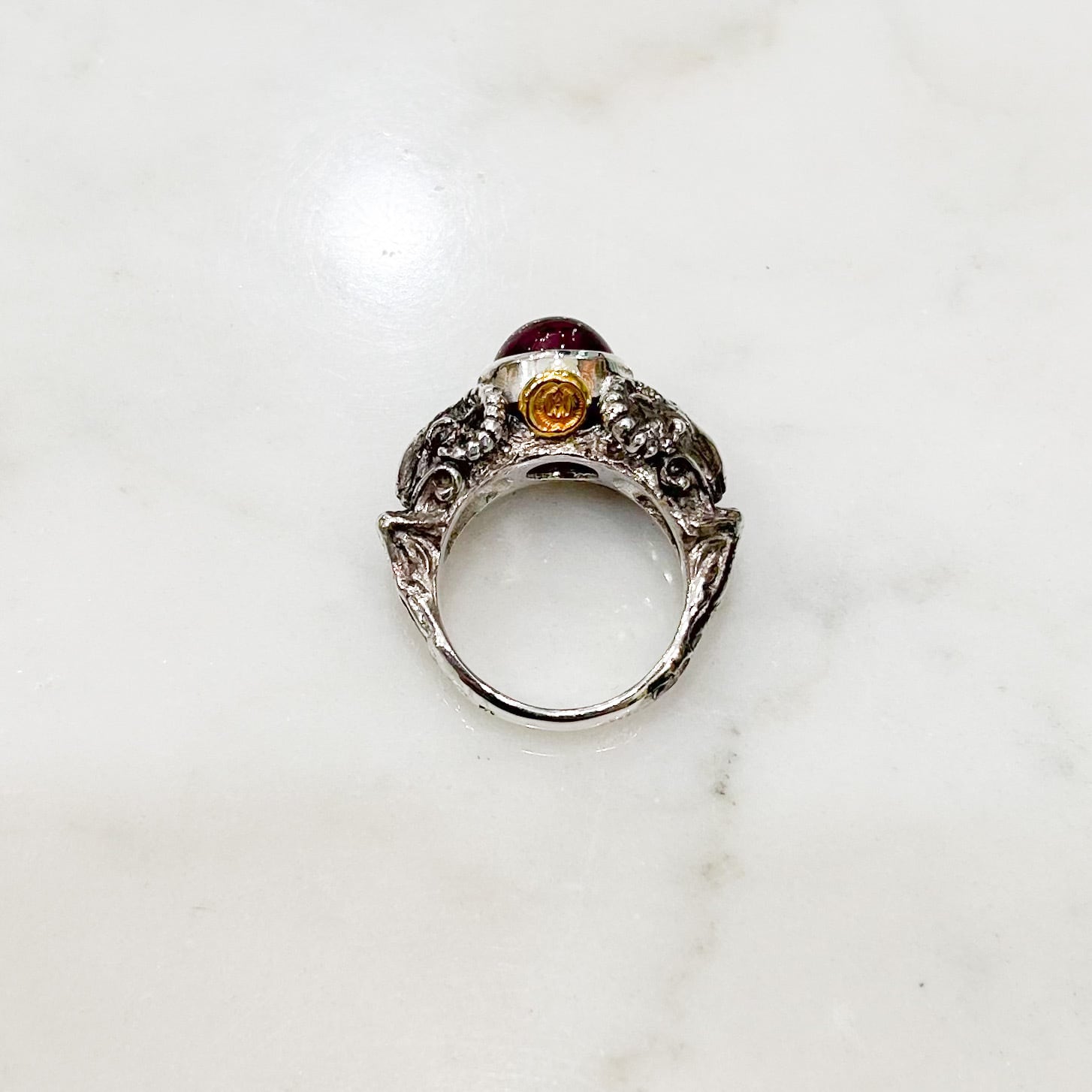 丸いルビー(6.14ct)の銀の山羊リング(24金の刻印付き)