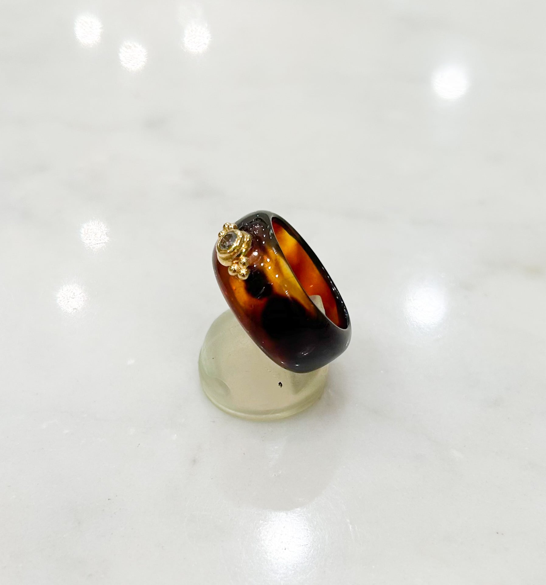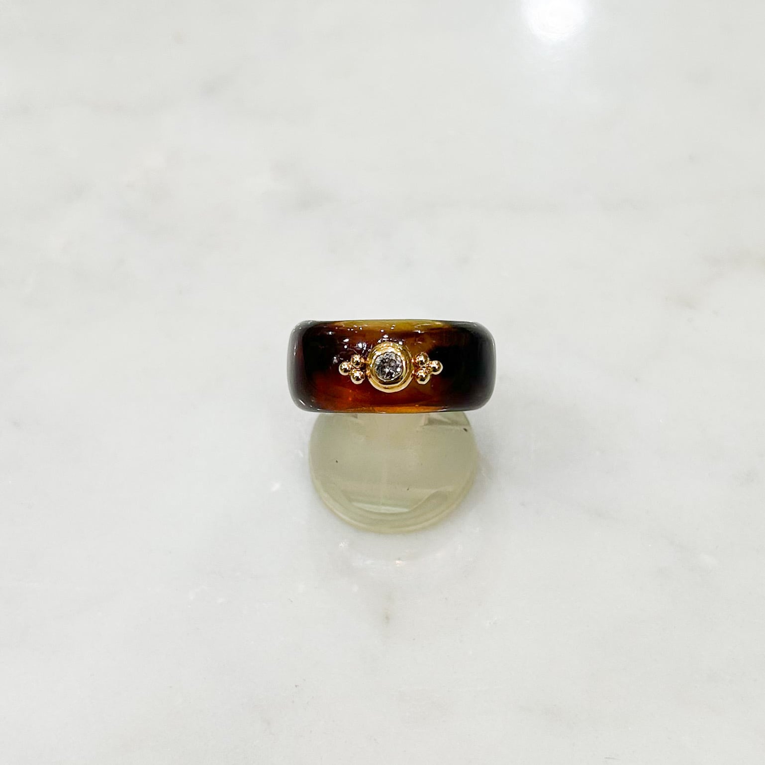 少し厚みを抑えて作ったべっ甲リングのベースは濃い褐色の部分と、半透明な部分が絶妙に混ざり合う特有の美しさ。