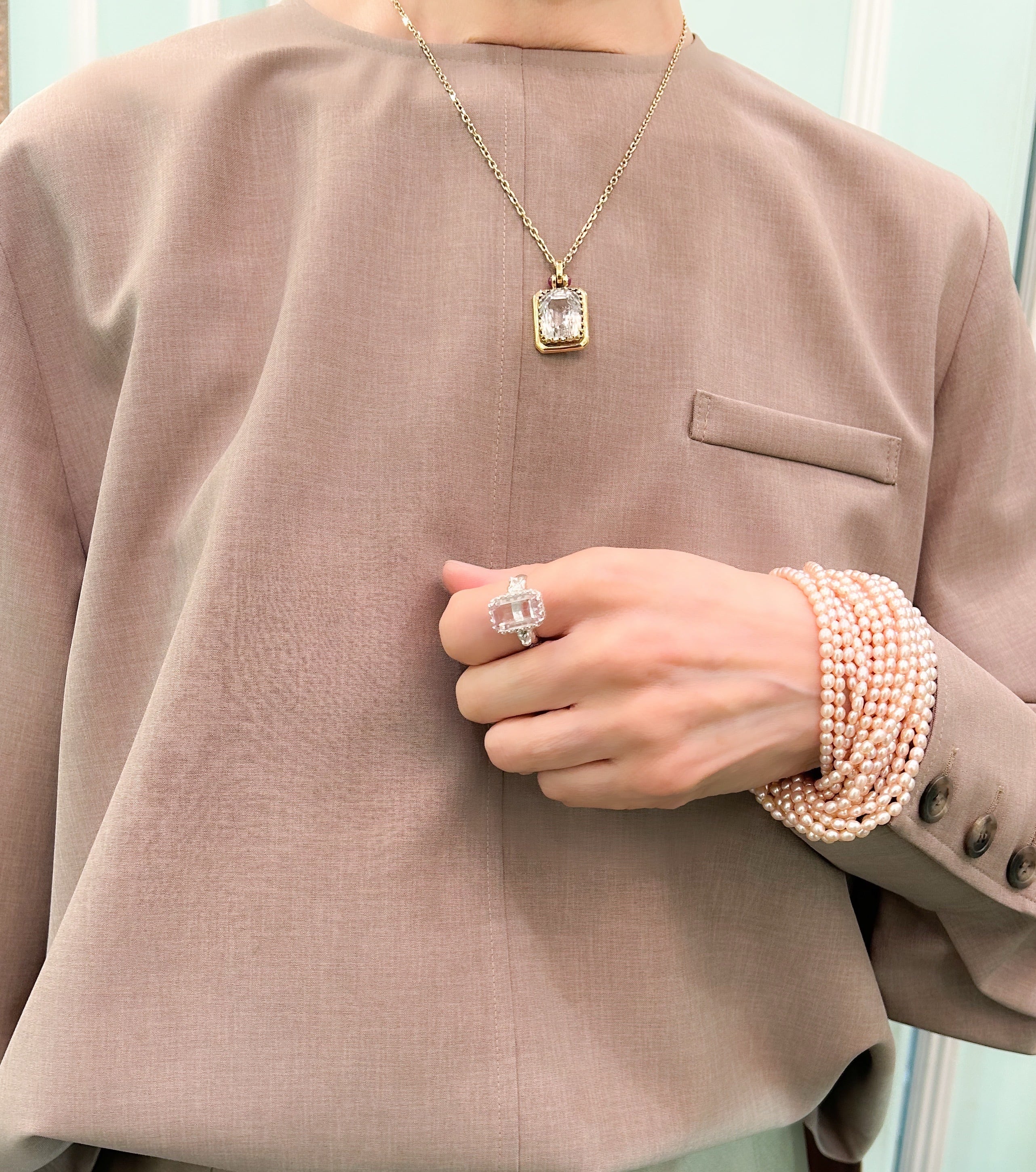小さな粒の多連のブレスレットはつける時に一捻りして付けると、見え方が変わります。