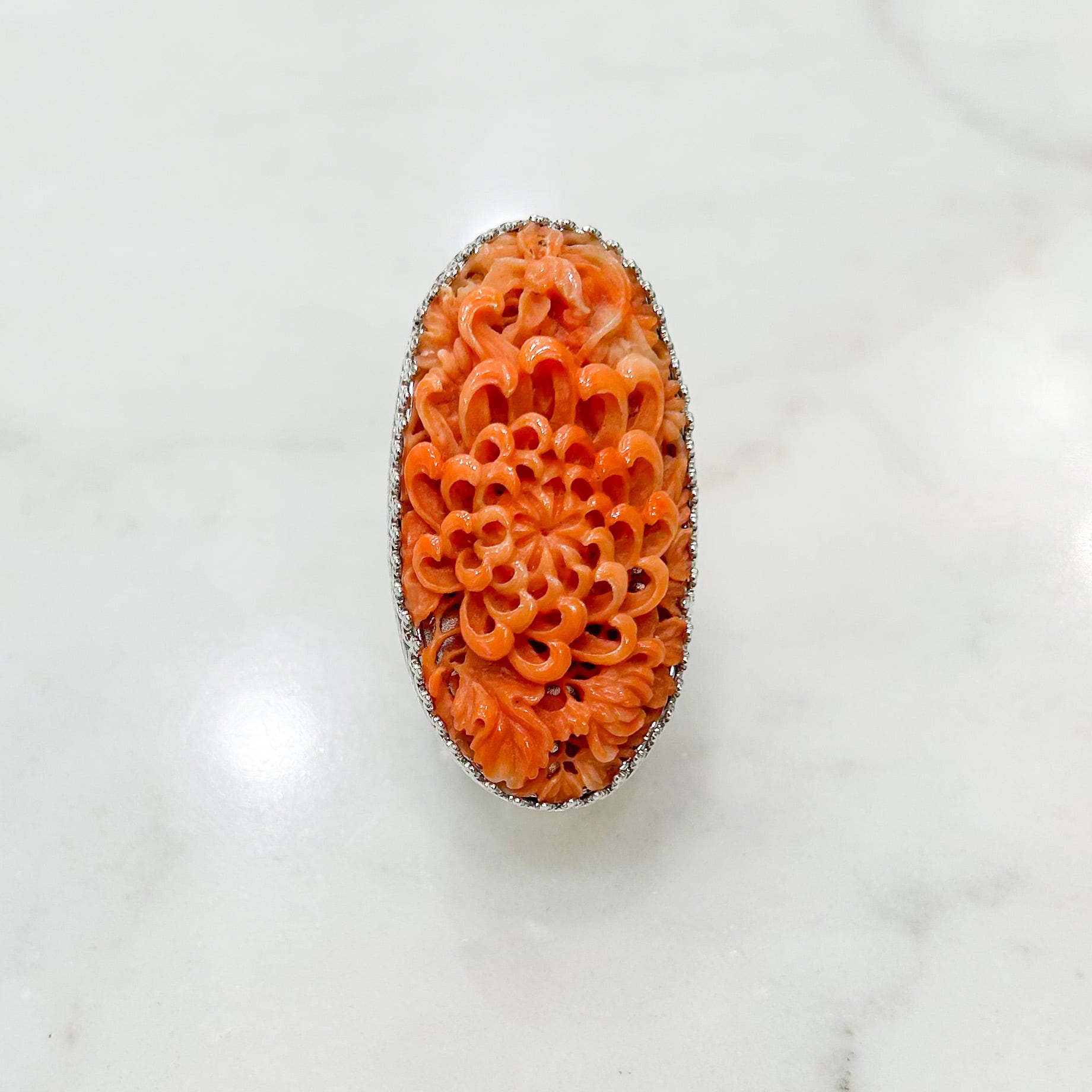 オレンジがかった赤い珊瑚を繊細に彫って、細やかな花びらが重なり合って咲いている大きな菊の花をセンターに。