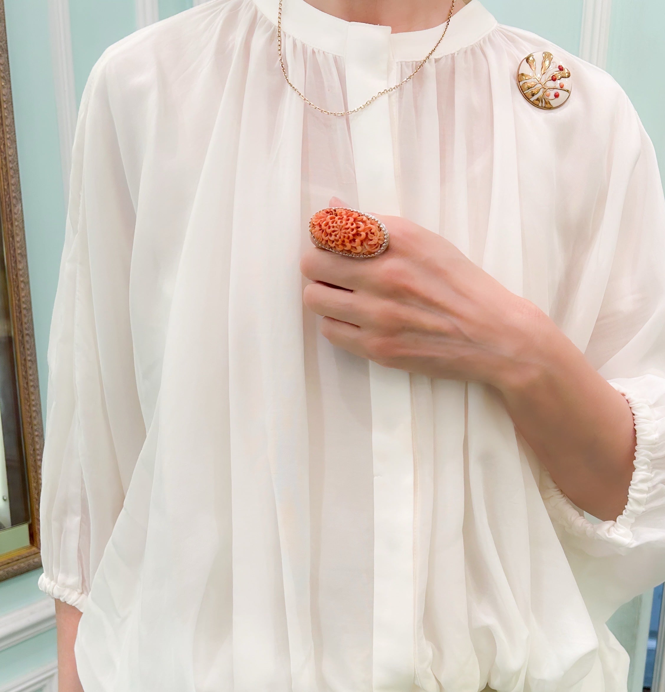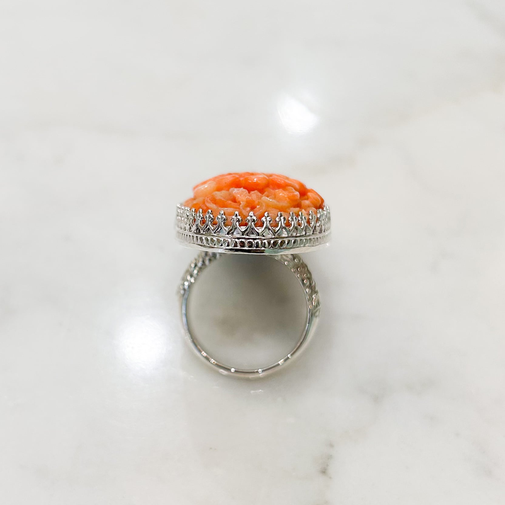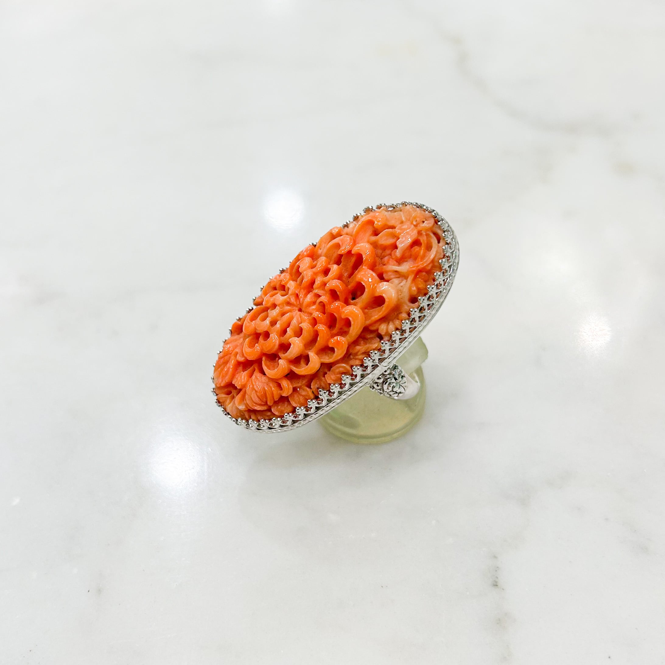 細かな珊瑚の菊を取り巻くのは、こちらも細かなシルバーの飾り爪。