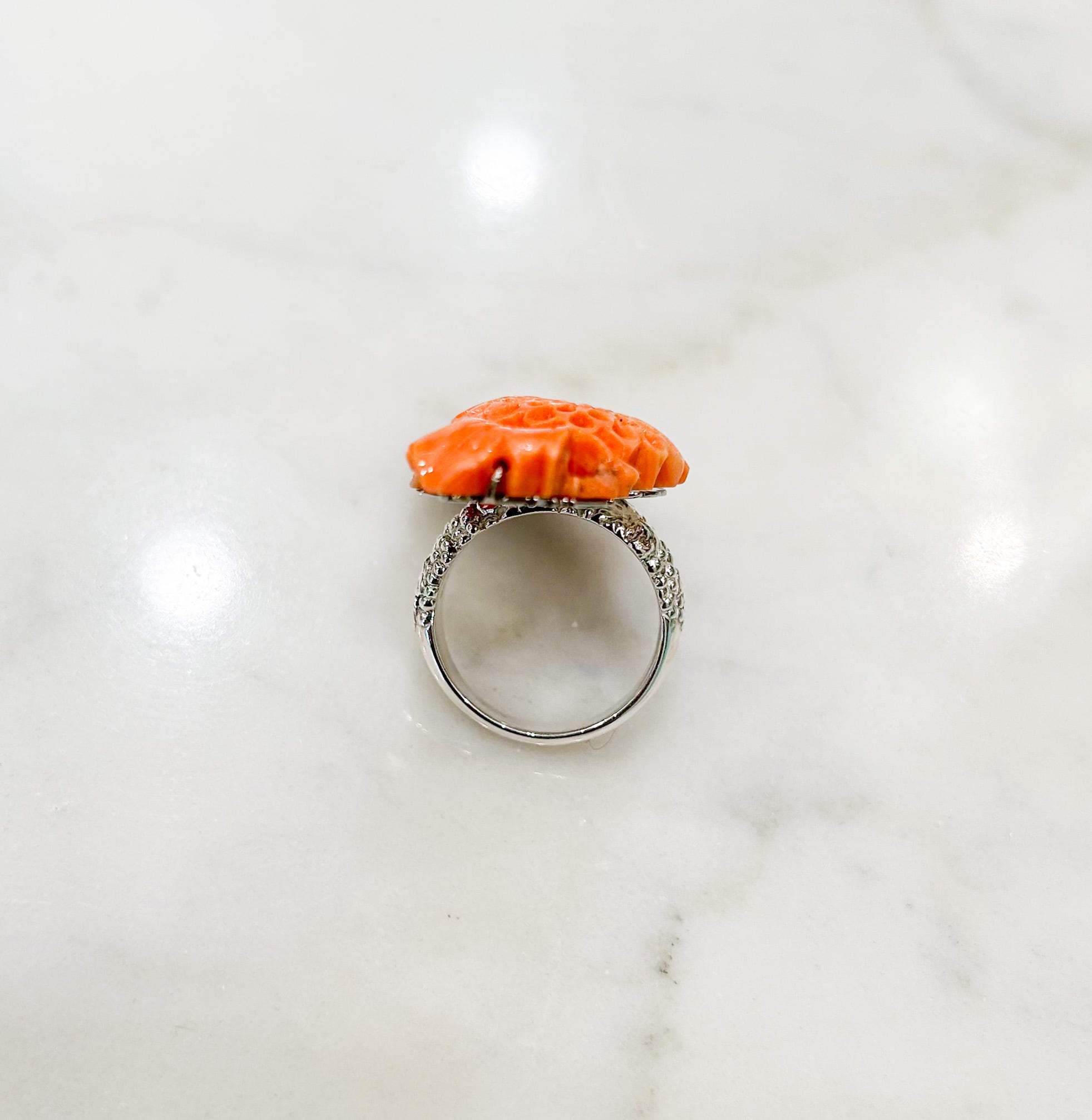 この珊瑚の彫りは縦にスーッと長い感じなので、指に載せた時も個性的なのにどこかスッキリとしたテイストに。