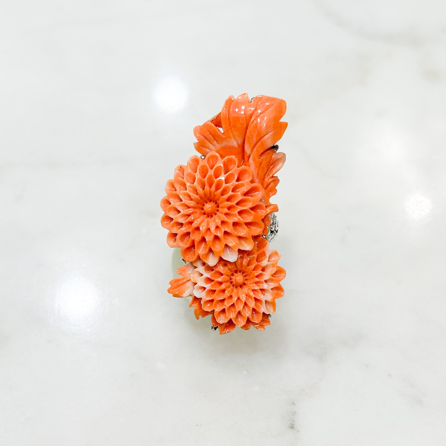 珊瑚という素材の質感と菊の花というモチーフはどこかオリエンタルなムードがあります。