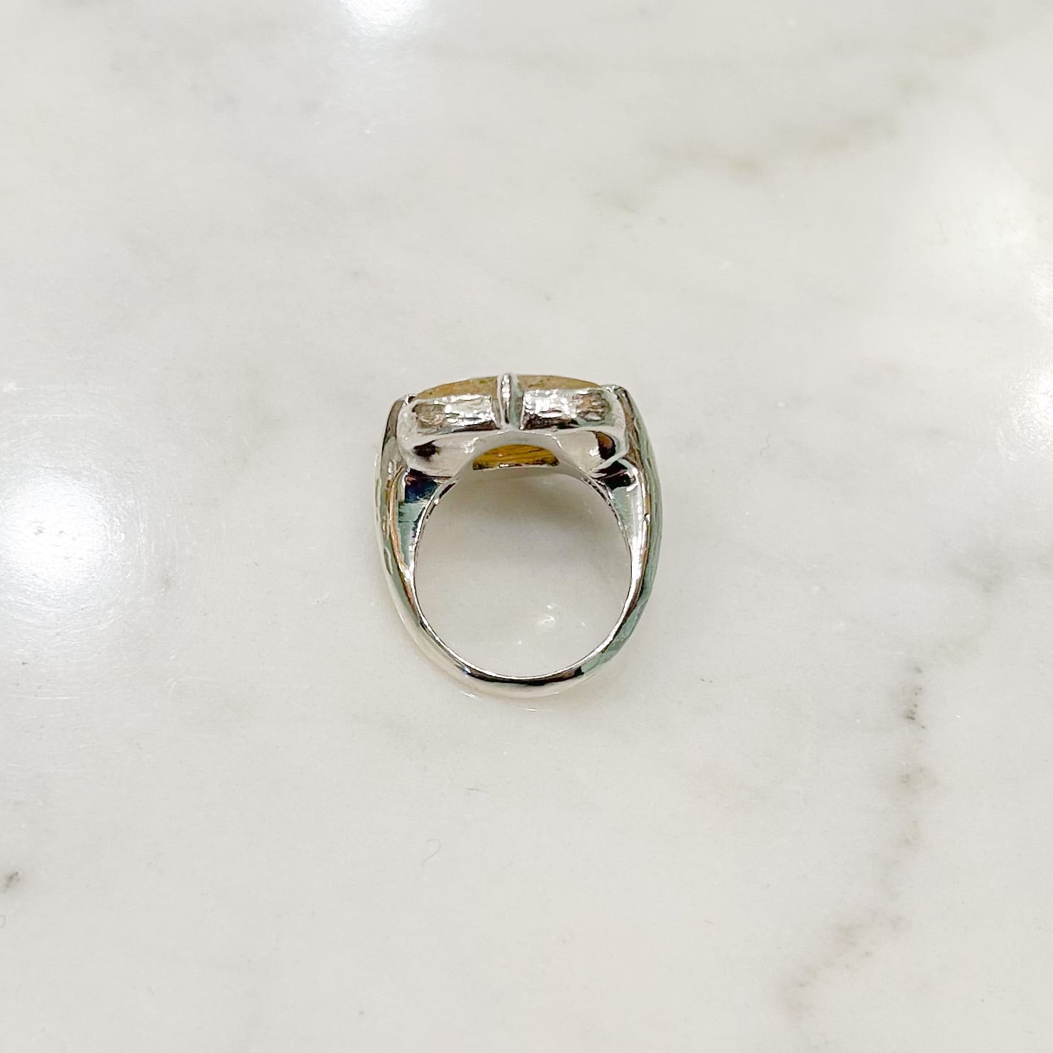 石周りの枠には細長い線のような彫りが施されていて、腕の部分や爪には小さな丸い打刻のような模様を施しています。