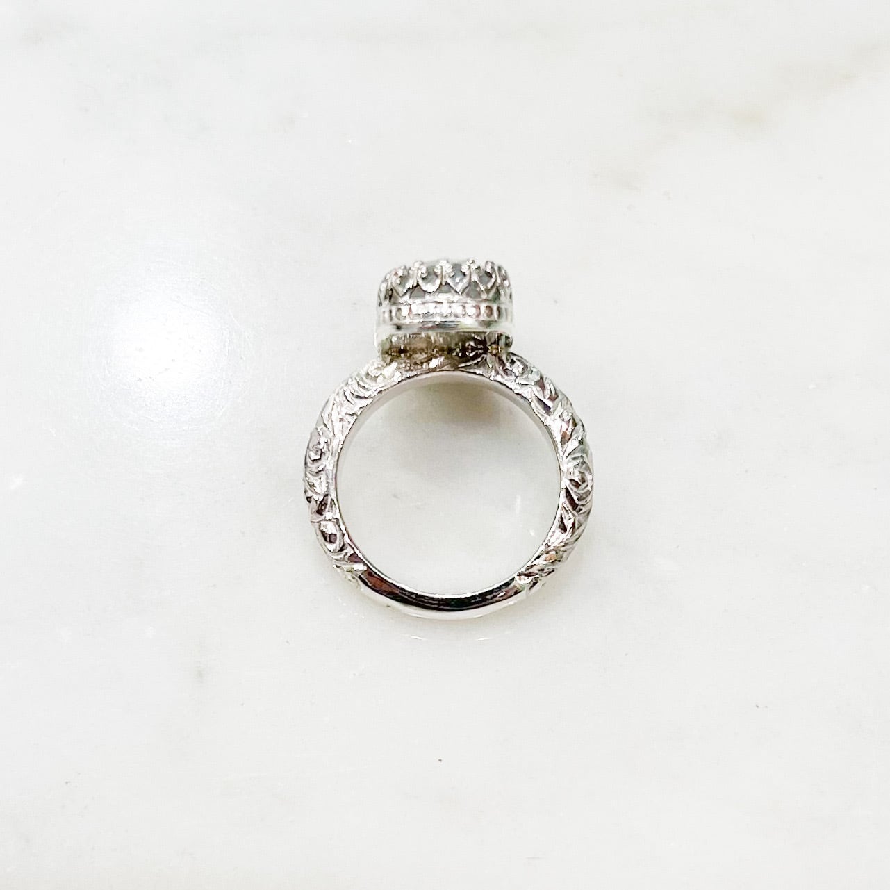 淡く優しいトーンのサファイアを王冠のような飾り爪で取り囲んで薔薇模様を彫っているシルバー台にセット。