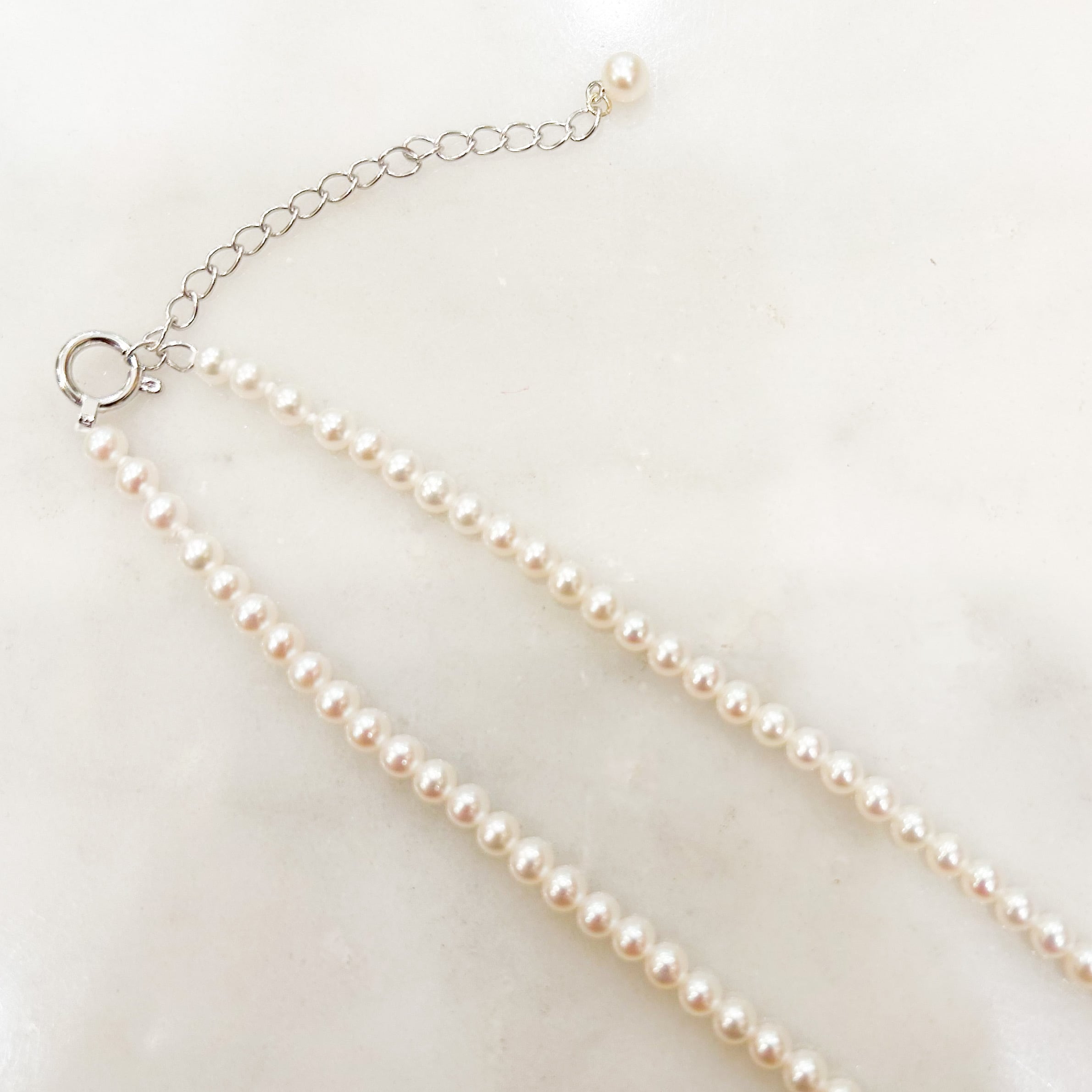 首の周りは3mmアップほどの小さな真珠で繋いでいるのですが、リボンとのジョイントの部分と、下に揺れる南洋のバロックパールのジョイント部分にはさりげなく18金を使っています。