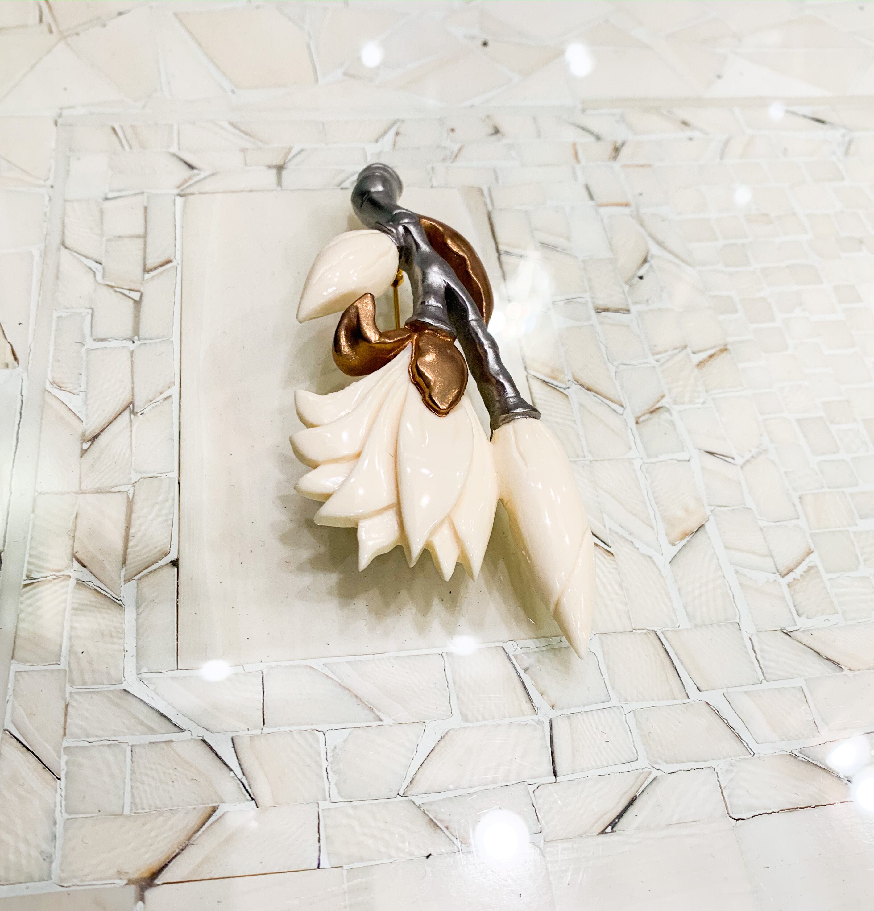 象牙色の樹脂に金・銀彩、木蓮のブローチ