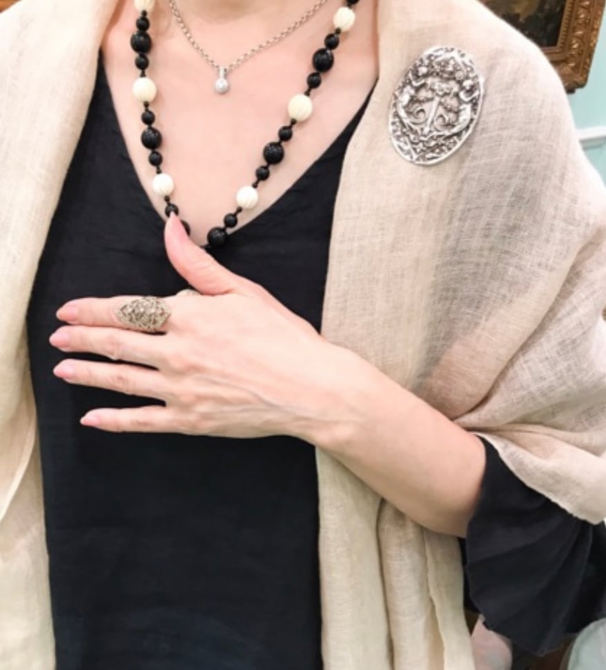まるでアンティークのような、燻した銀の美しさが際立つ、楕円形のブローチです。
