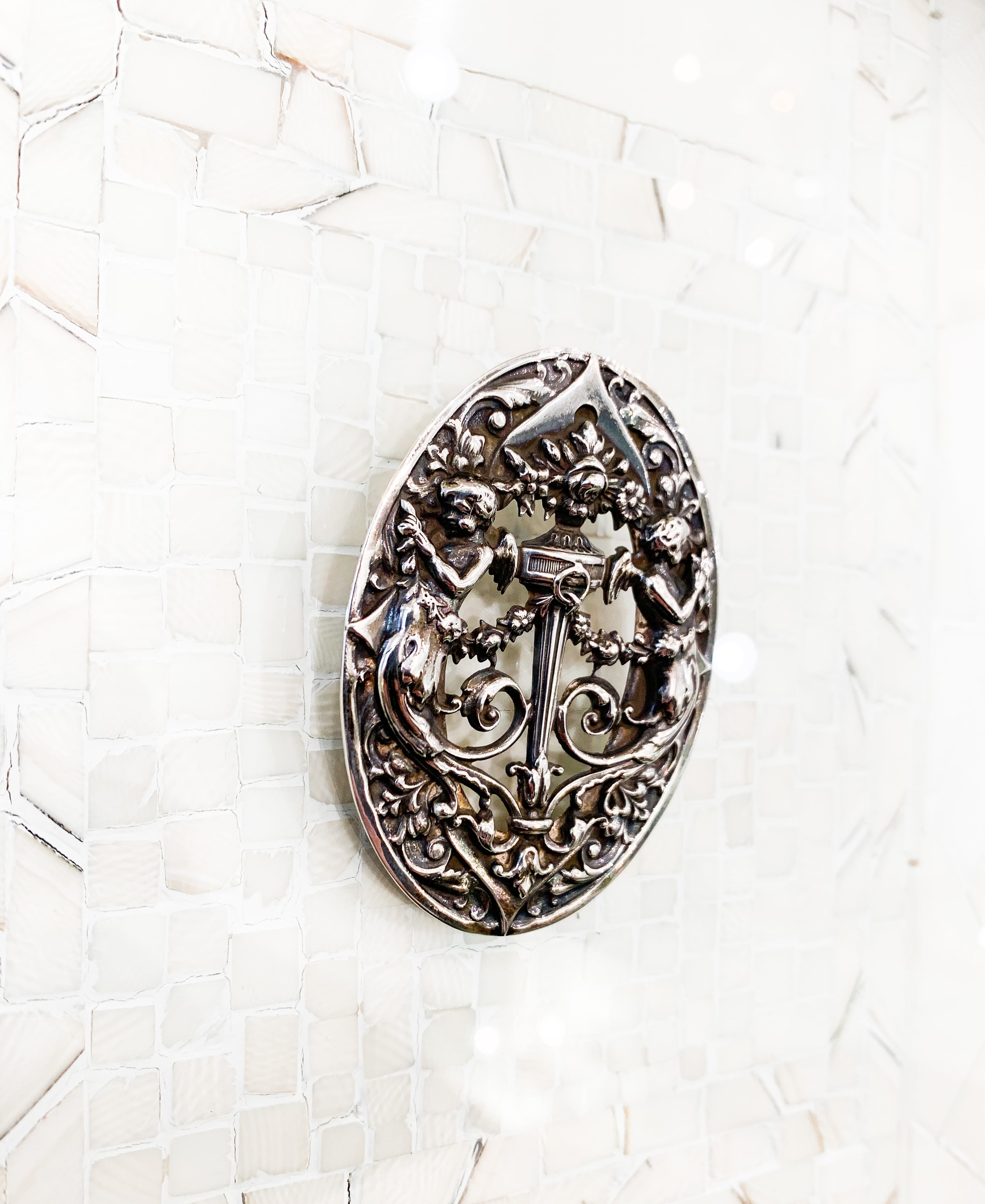 2柱の天使が背中合わせの透かし細工のシルバーブローチ