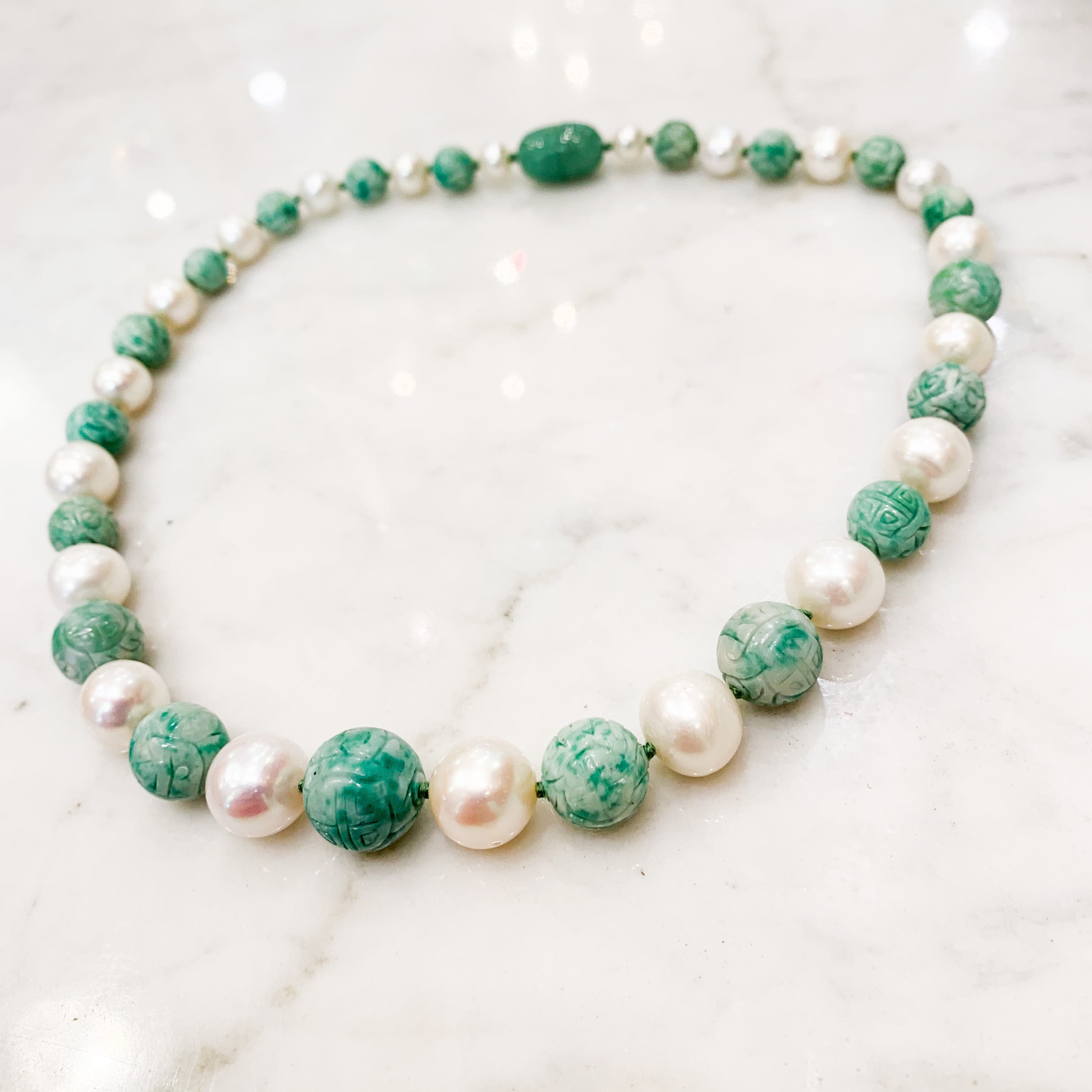 グリーンジェイドには彫りが施されていて、その色合いと相まって、とてもオリエンタルな雰囲気。