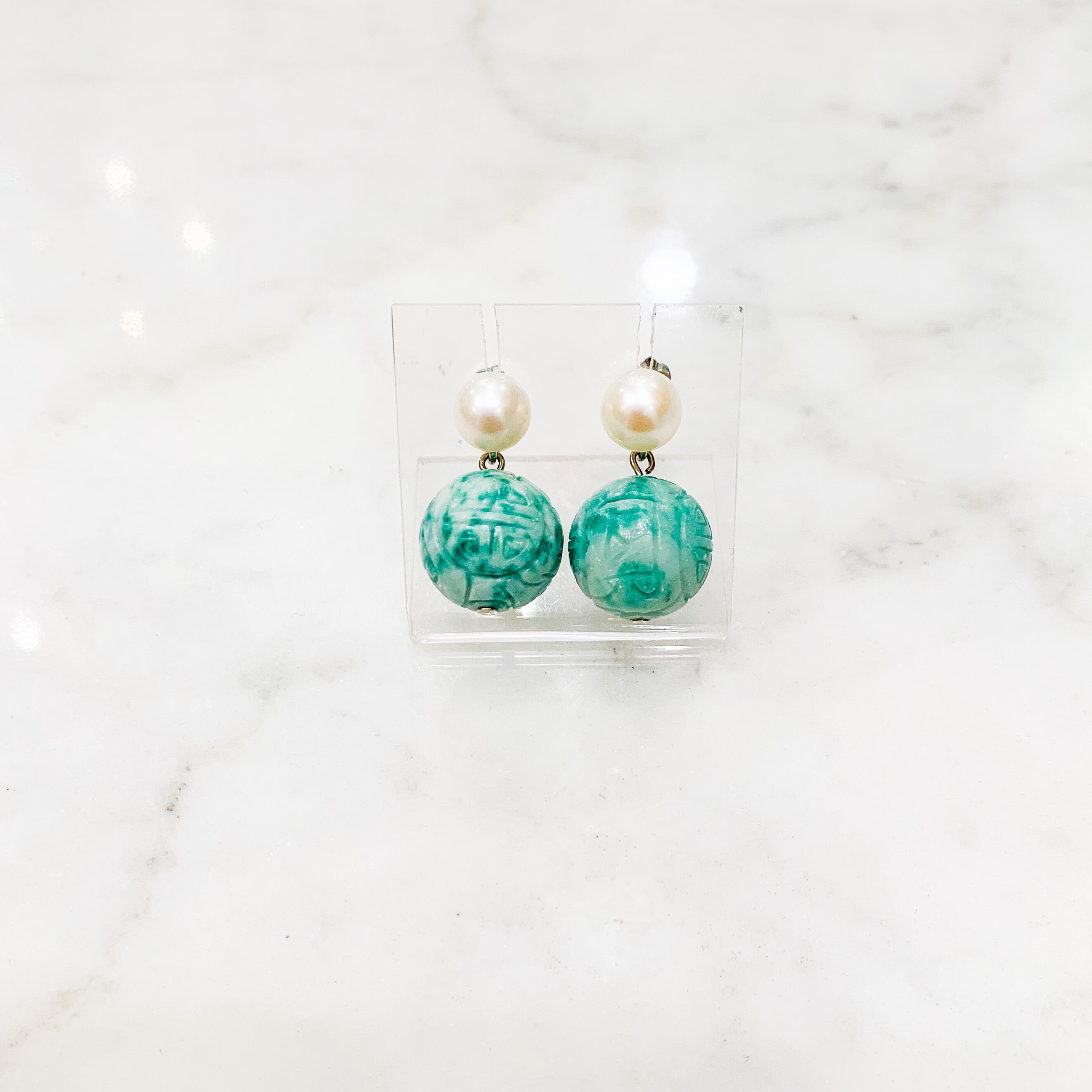7mmアップの真珠の下に、14mmのグリーンジェイドがスィングするピアスです。