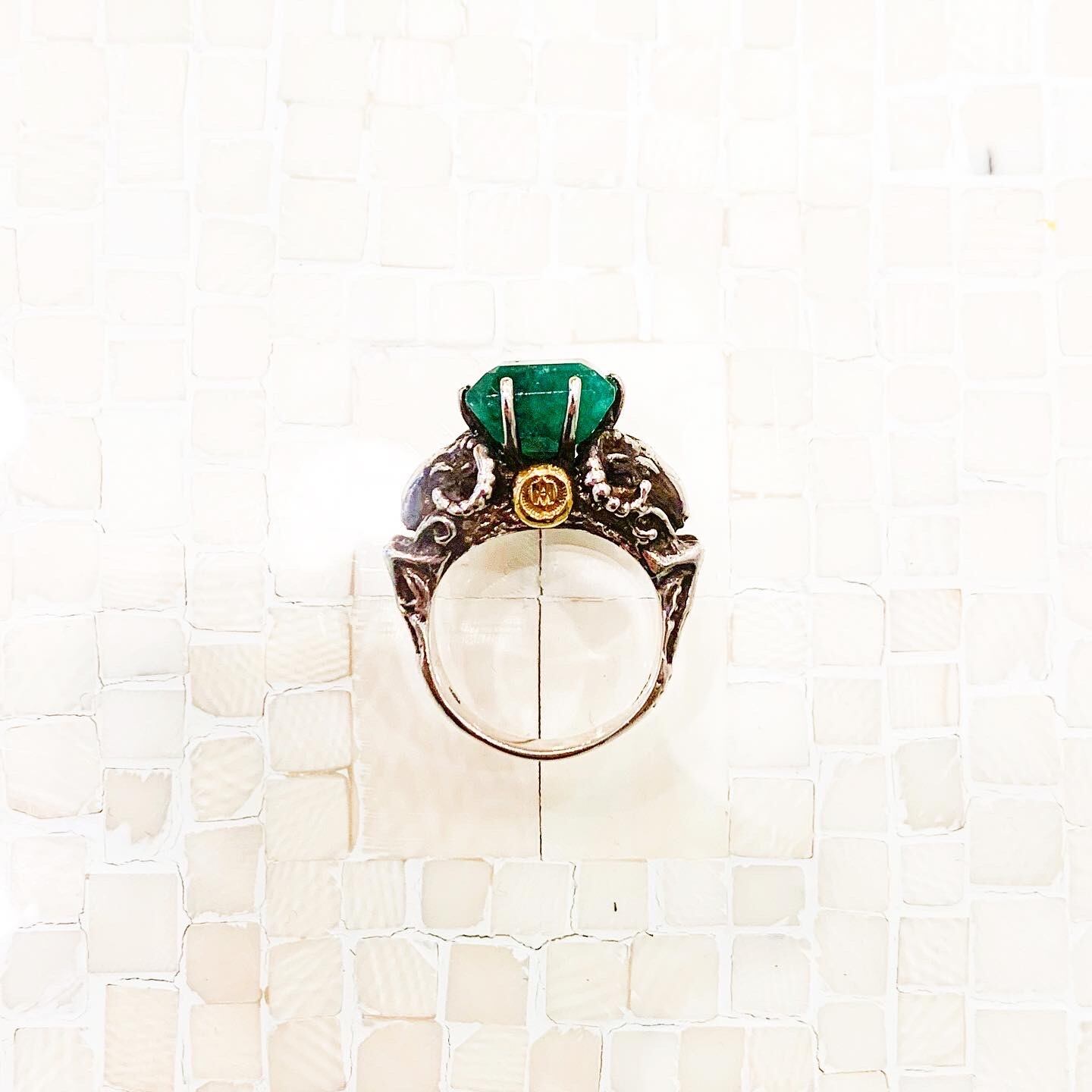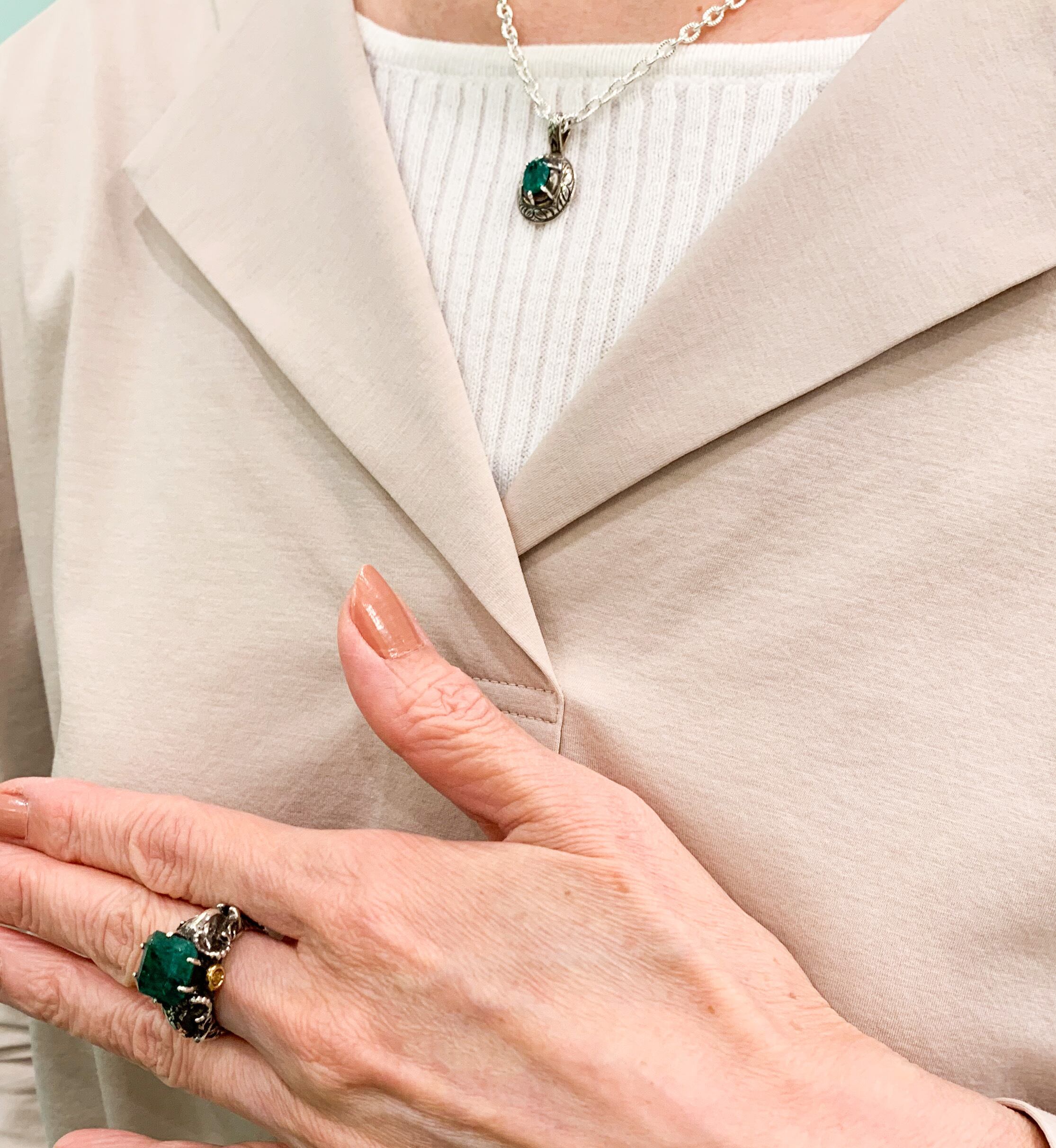 アンティークのように燻の加工が施された銀の輝きと、古いエメラルドの色がとても良くマッチしています。