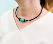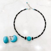 そしてターコイズのサイドには円盤型のオニキス、首回りにも細長い管のようなオニキスがグルリと使われています。