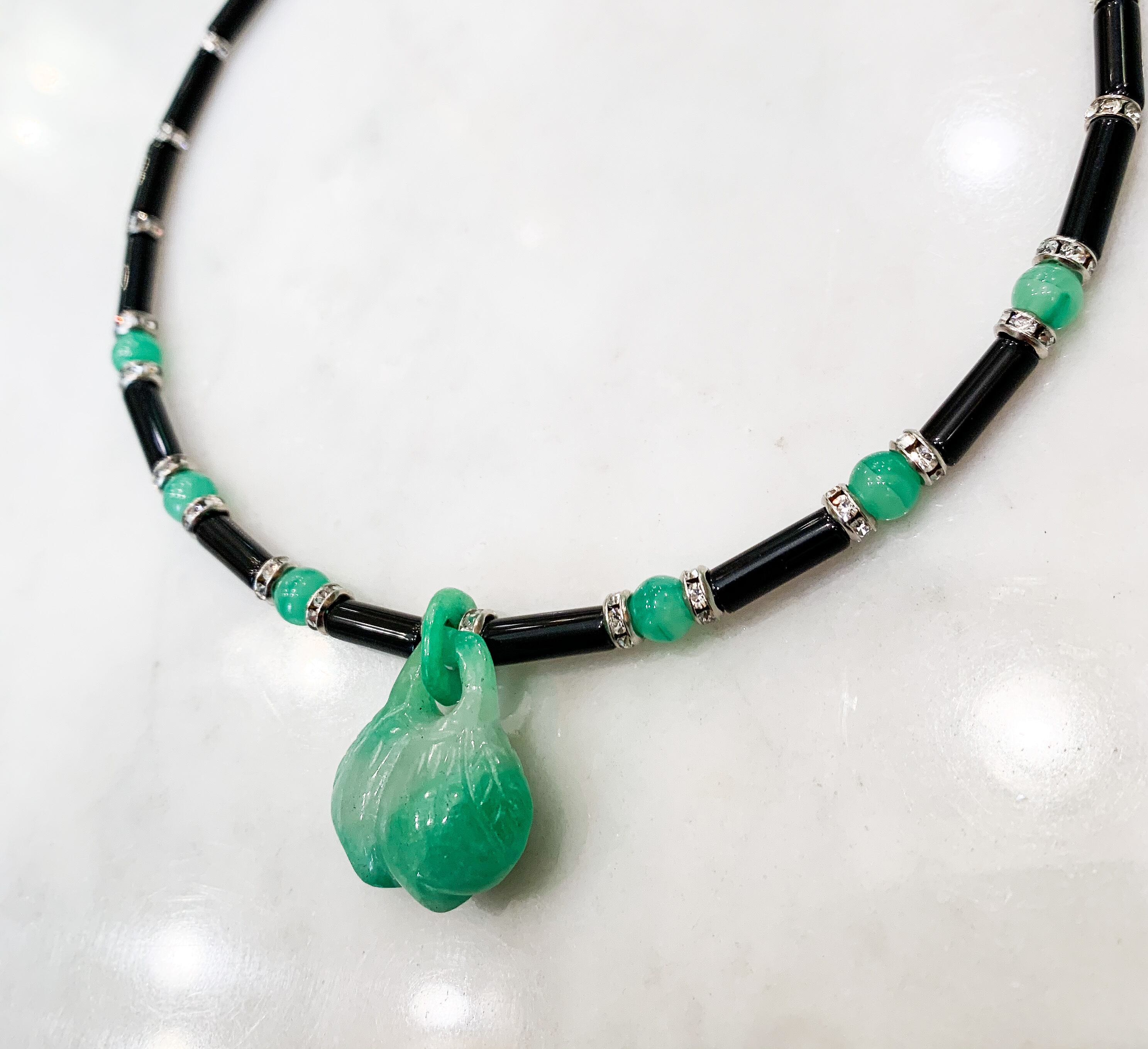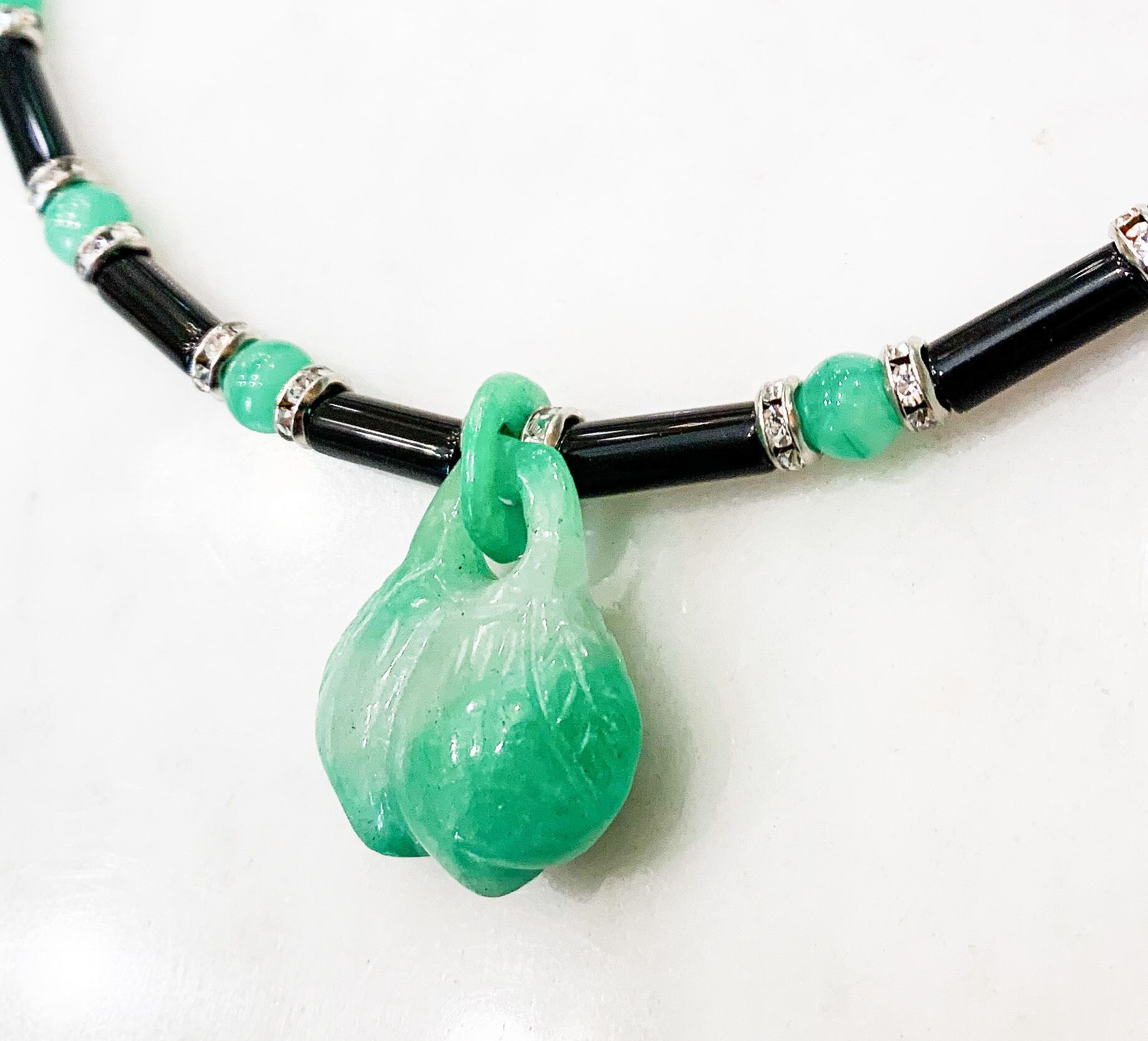 桃の形の玉(ギョク)をセンターにした、オニキスのワイヤーチョーカー