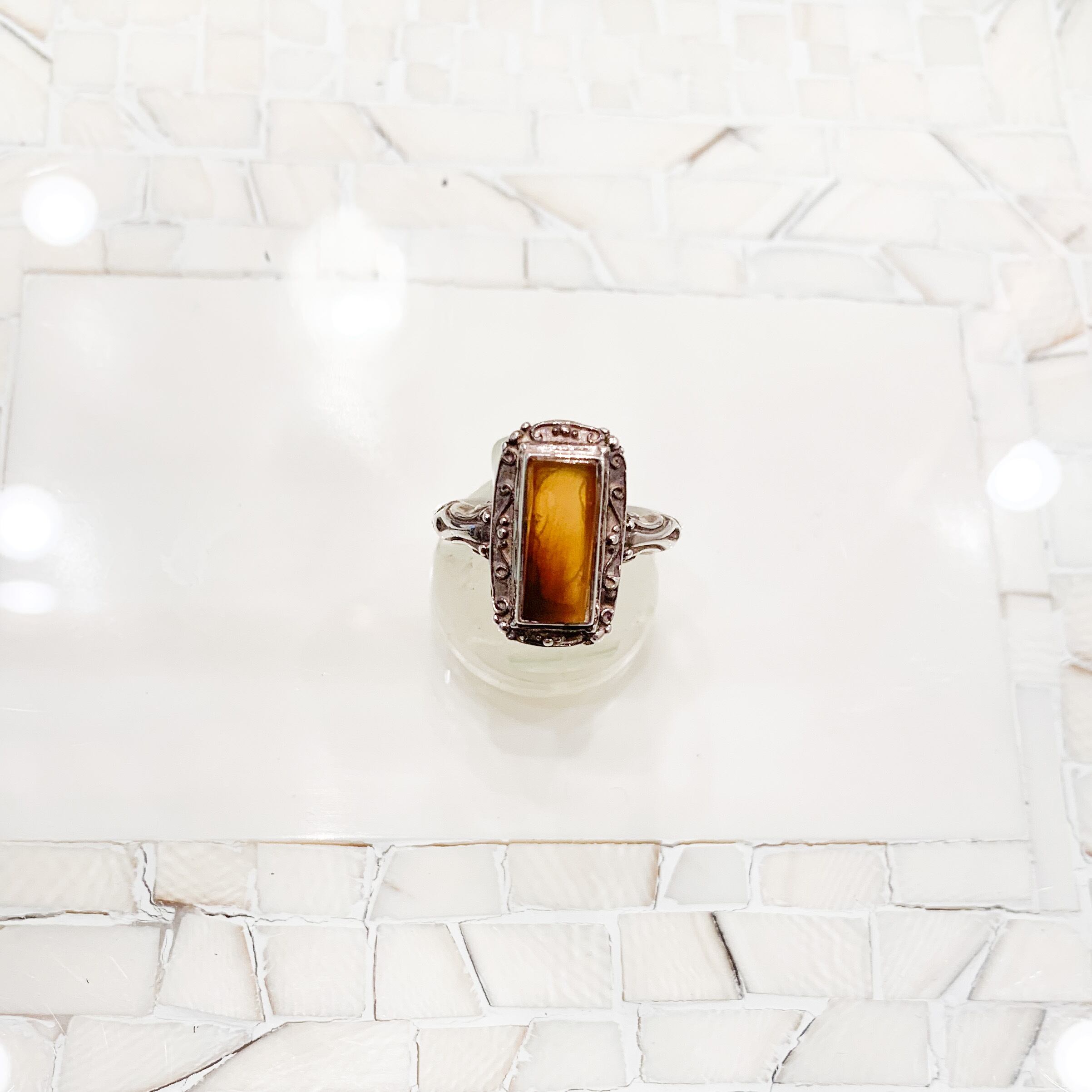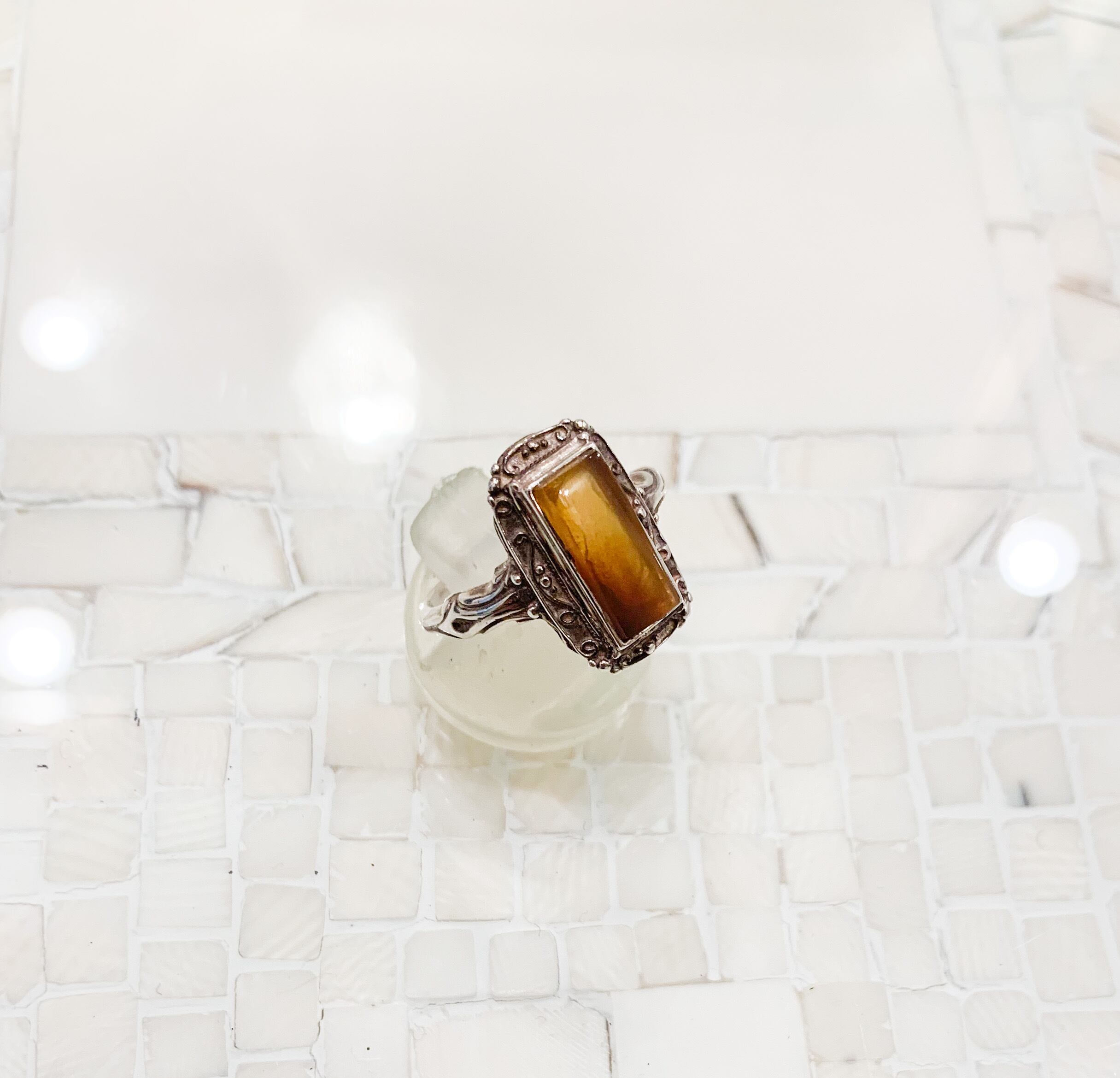 細長いべっ甲を、クラシカルで繊細なデザインのシルバー台にセッティングした、さりげなく使えるシルバーリングです。