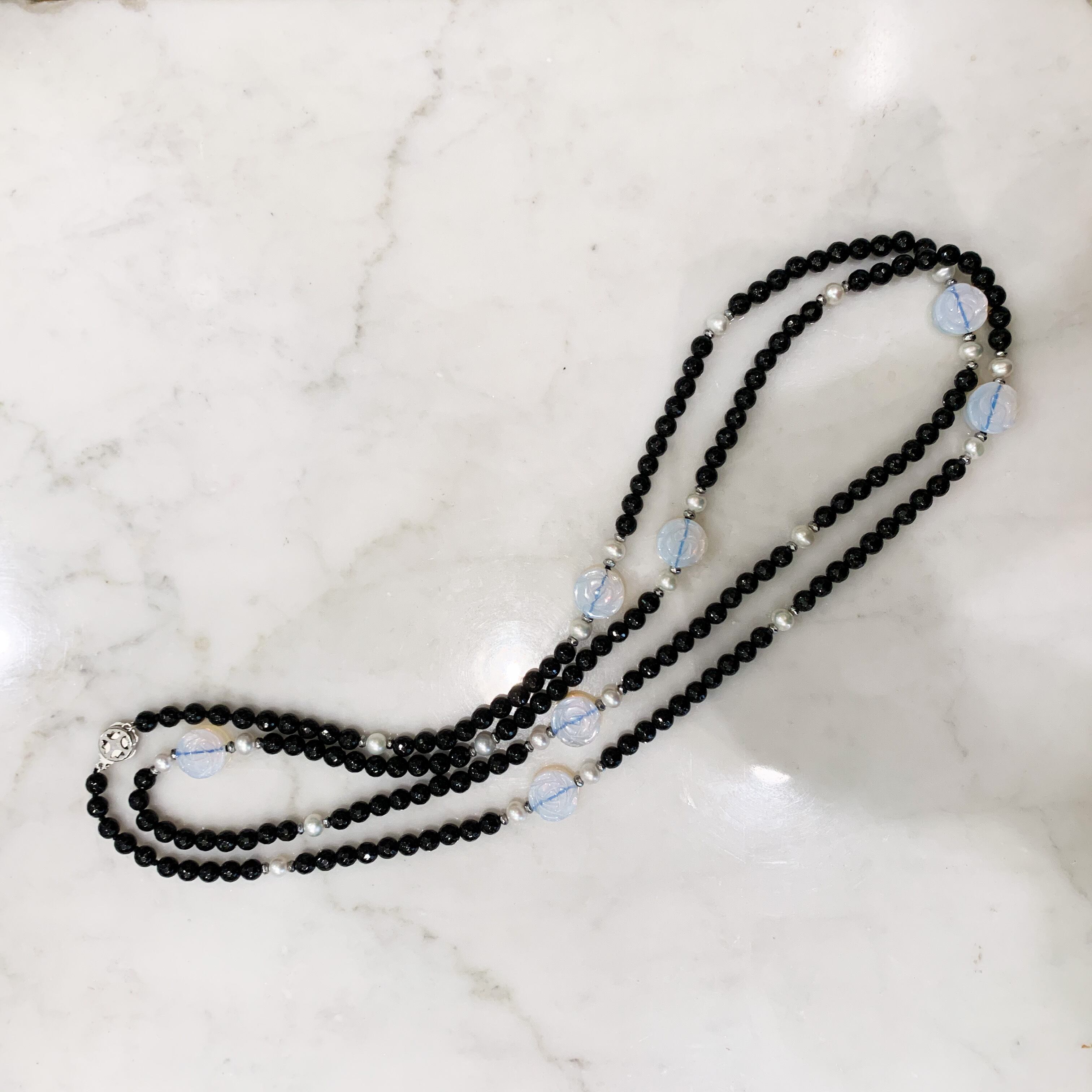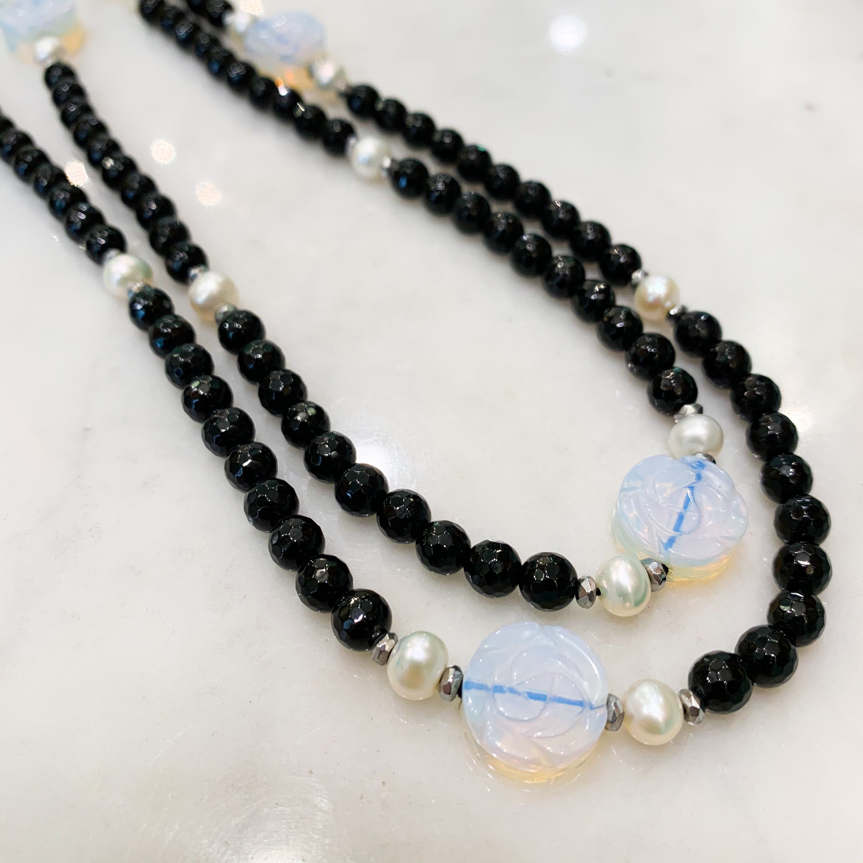 カットが施された6mmのオニキスをメインにして、半透明な淡いブルーのバラの花のように彫られたミルキージェイド、白い真珠、そしてアクセントにメタリックな輝きのヘマタイトを使った、ロングネックレスです。