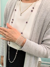 その優しい水晶の間に、楽しい形のアメジストと真珠とラインストーンがアクセントになってくれています。