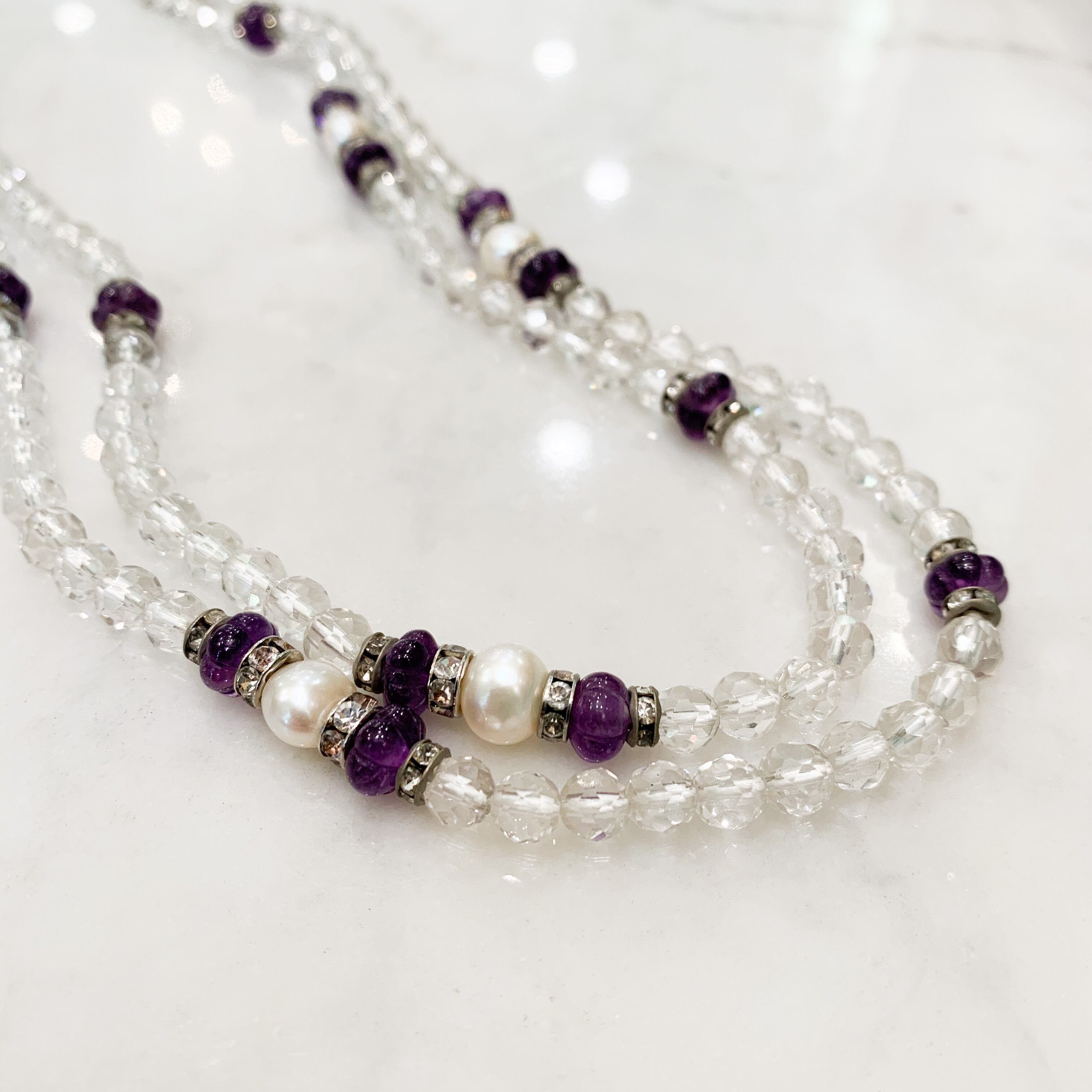 カットが施されて優しく輝く6mmの水晶の間に、南瓜のような形のアメジストと真珠、キラッと輝くラインストーンを使ったロングネックレスです。