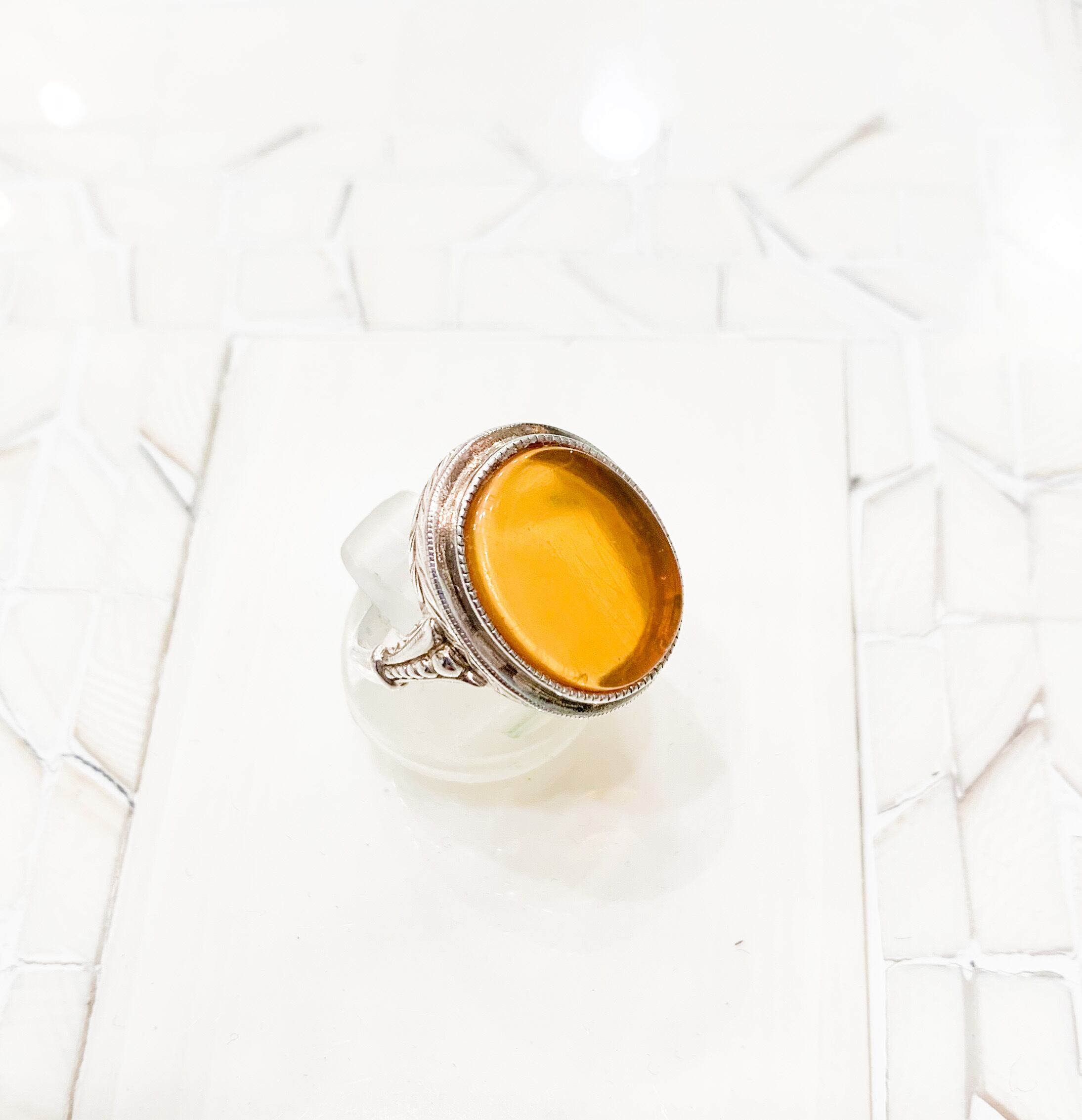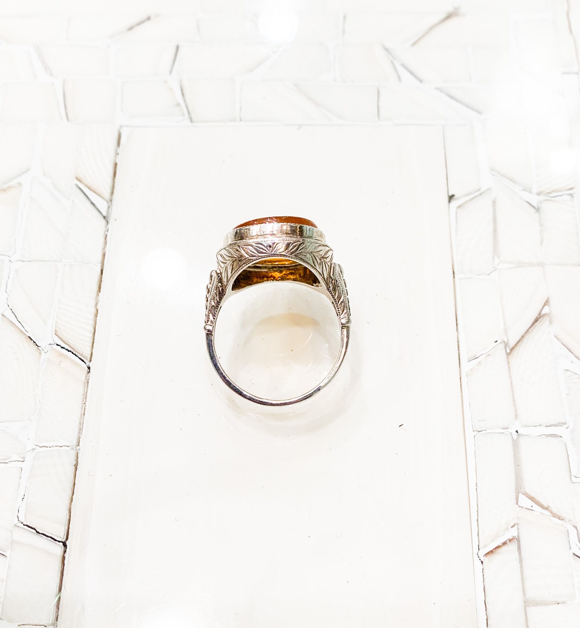フラットな楕円形の白べっ甲をシルバー台にセッティングした、シンプルなデザインの指輪です。