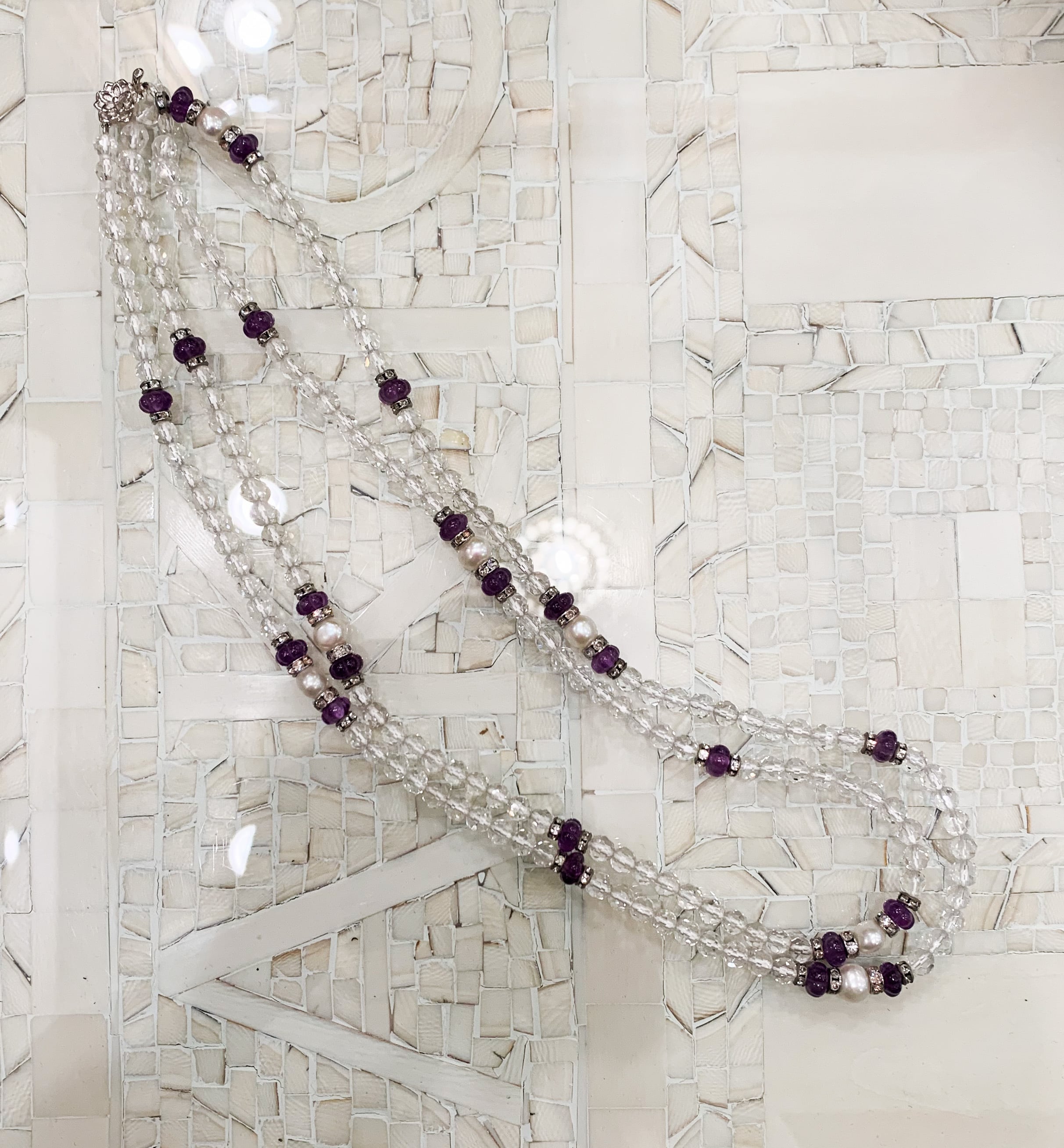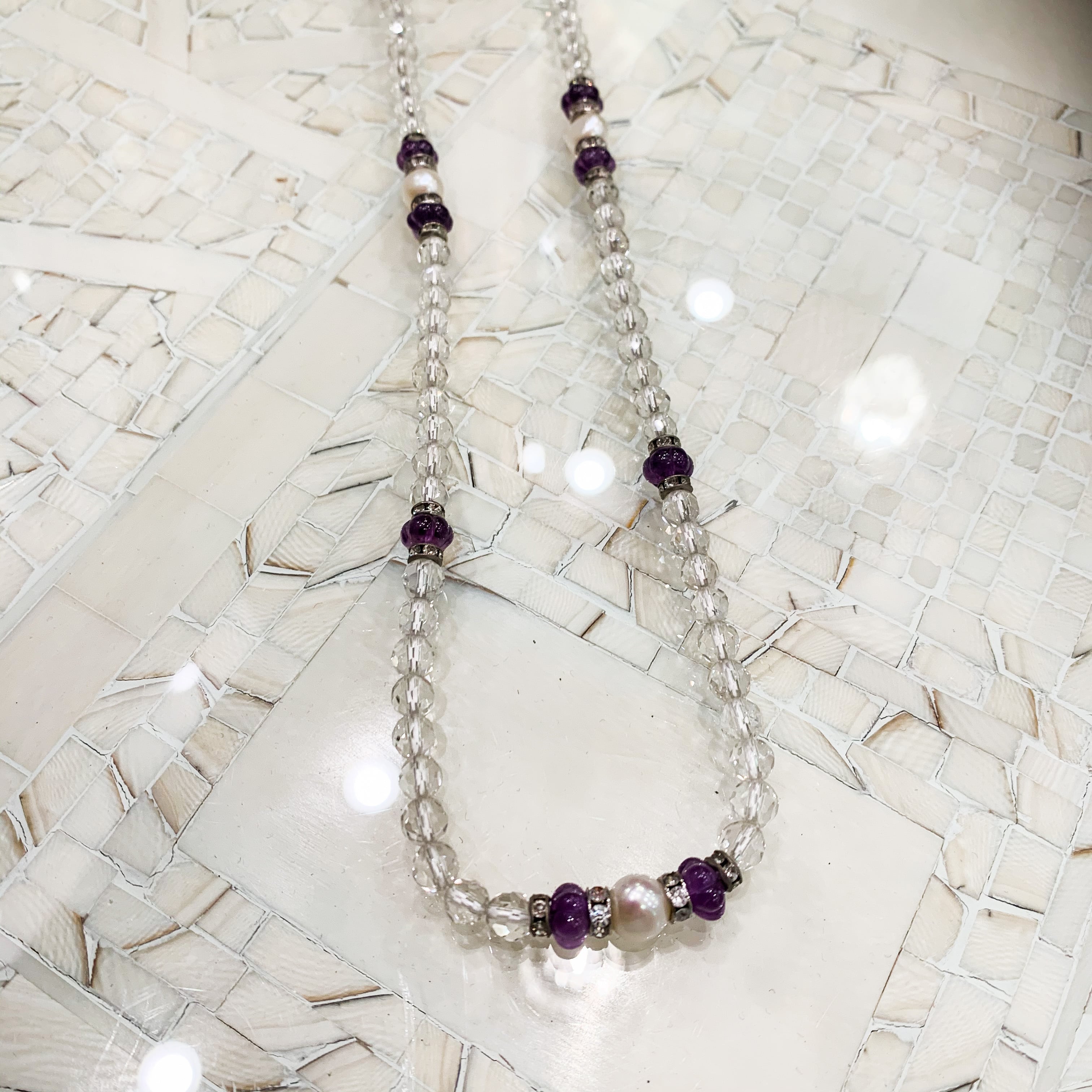 カットが施された水晶と真珠、アメジストとラインストーンのロングネックレス