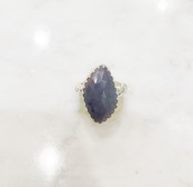 アキオモリの作る指輪としては小さい方ですが、普通の指輪としては決して小さめとは言えない大きさのサファイアですが、流れるような楽しい形と、その形に似合うブルーグレーの色で、大きさを感じさせません。