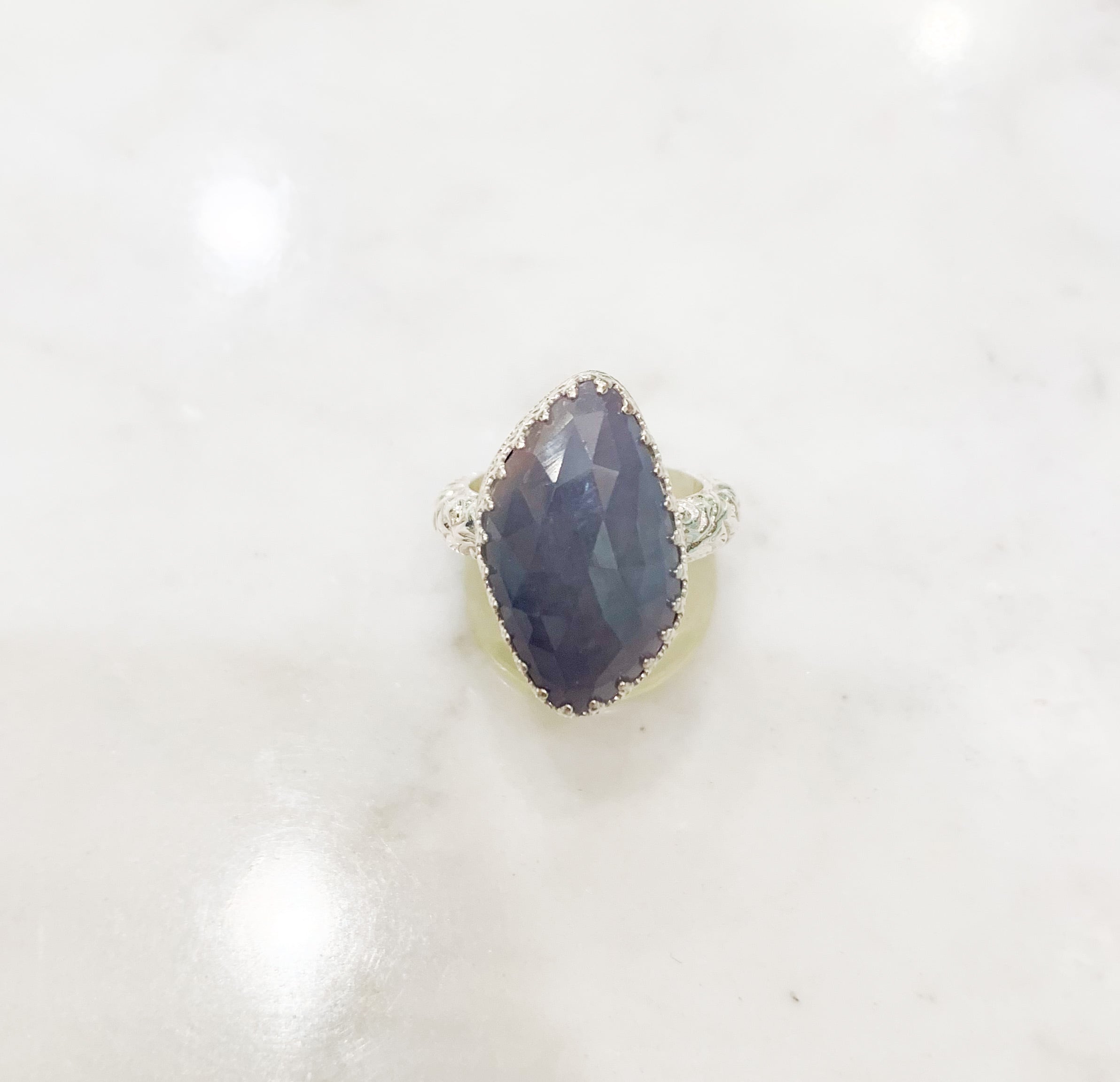 シルバーで王冠留めされたブルーグレーのサファイア(11.26ct)の指輪