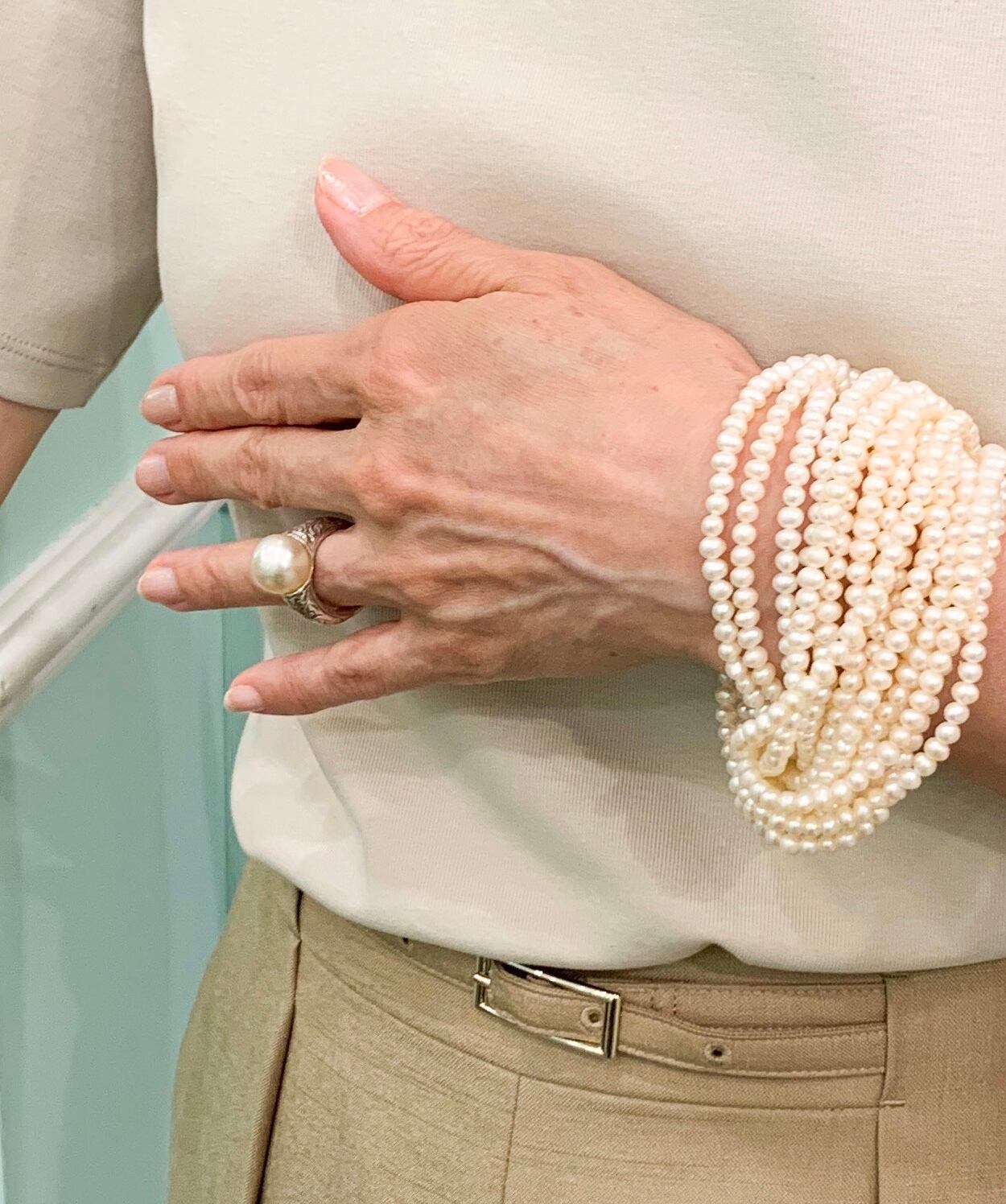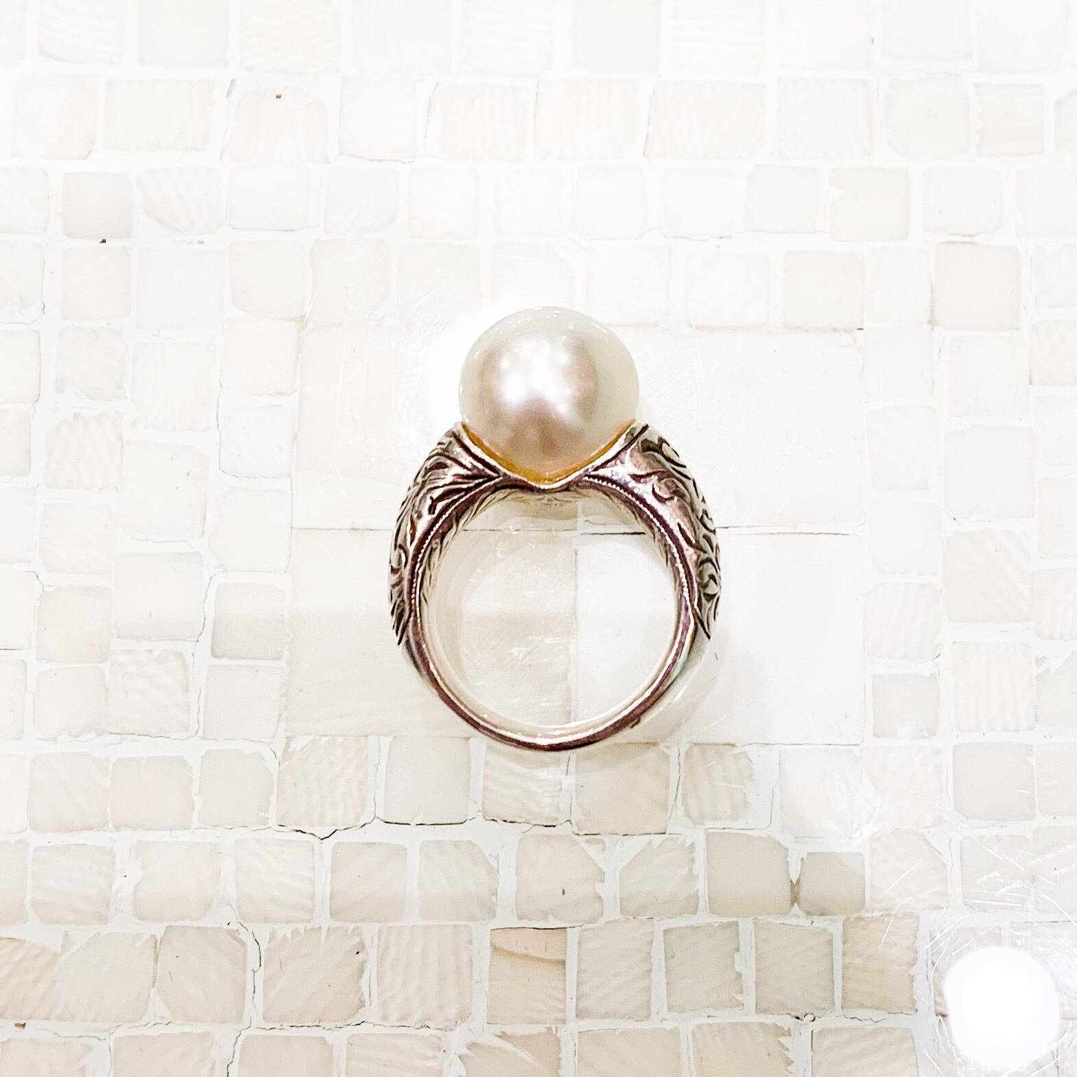 12mmオーバーの南洋真珠の指輪なんていうと、マダム感が漂いそうですが、アンティークを思わせるような、彫りを施したシルバー台にセッティングすることで、軽い装いでも楽しめる指輪になっています。