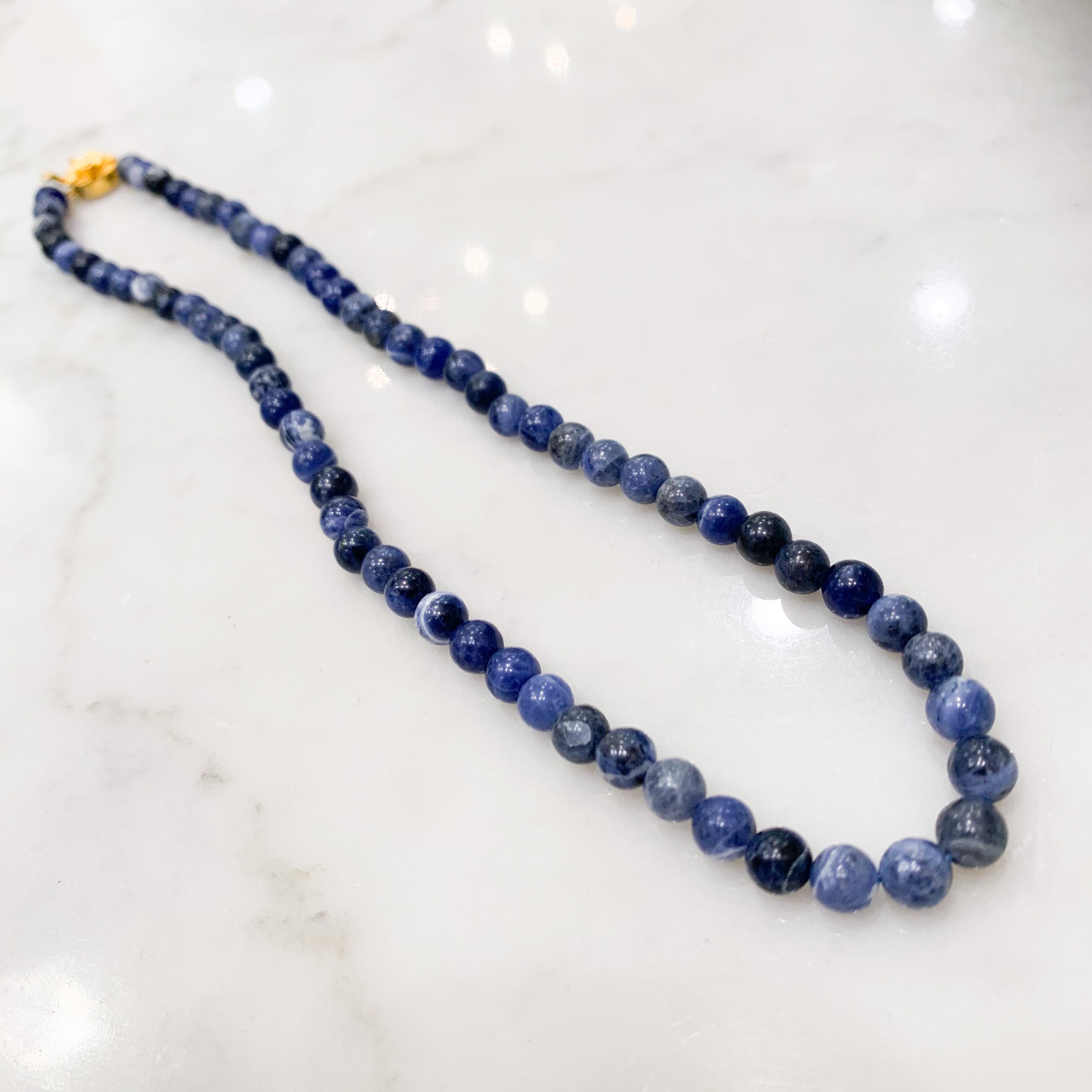 6mmの小さめのソーダライトを、サッと糸を通して繋げた、シンプルなネックレスなのです。