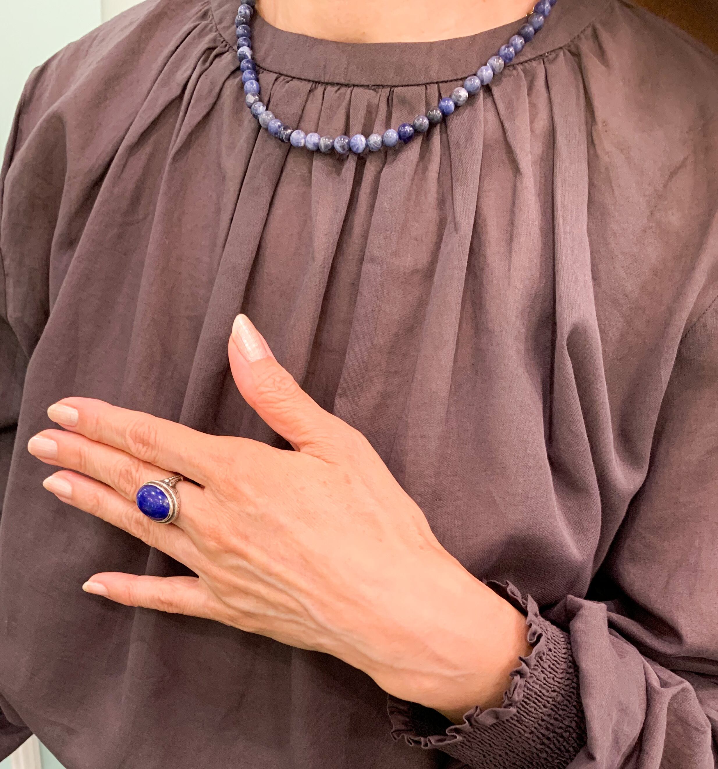 ラピスラズリと同じような色のソーダライトという石のネックレス。