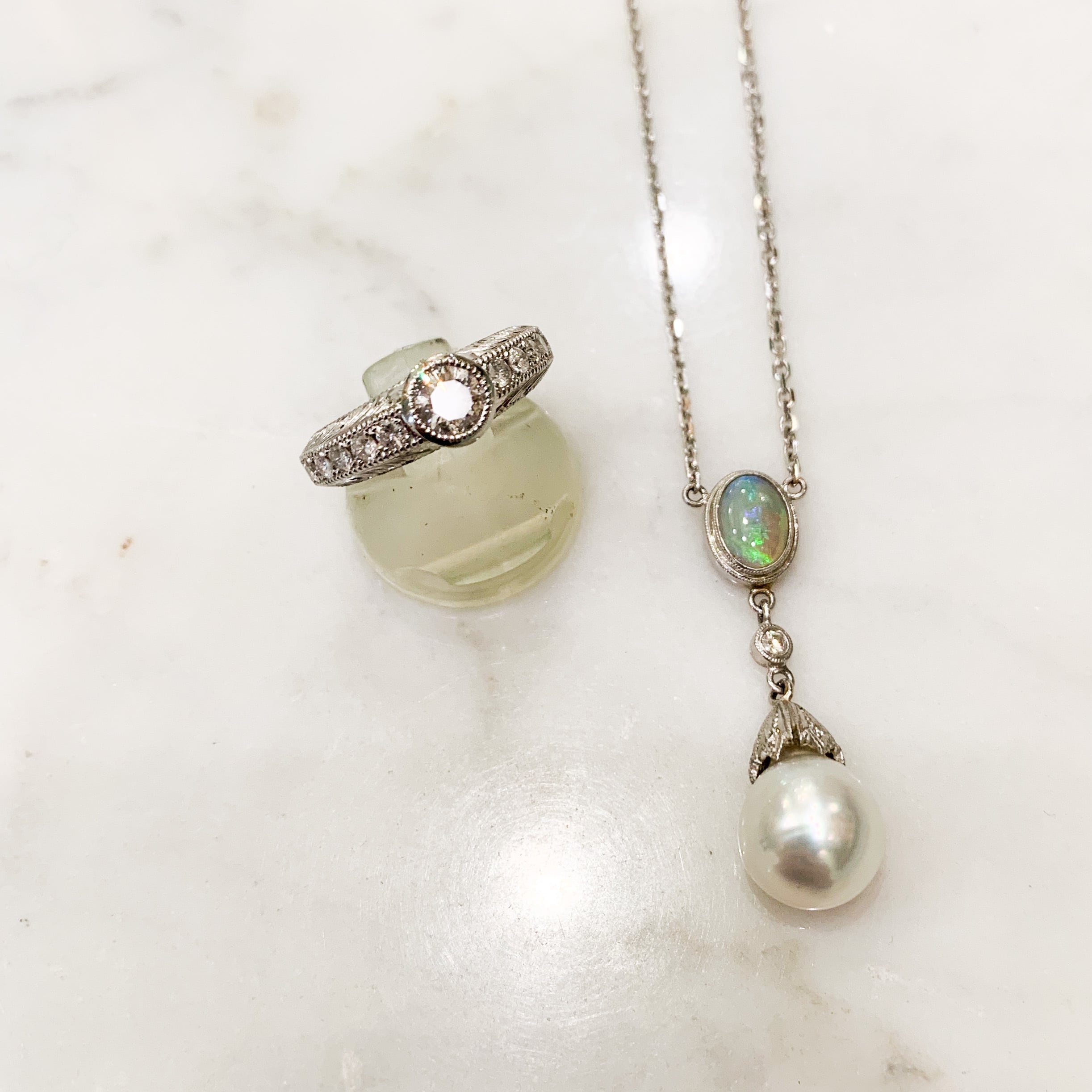 プラチナとダイヤモンド、そして白い南洋真珠と、全体の色のトーンが強くないので、オパールの繊細な美しさが際立ちます。
