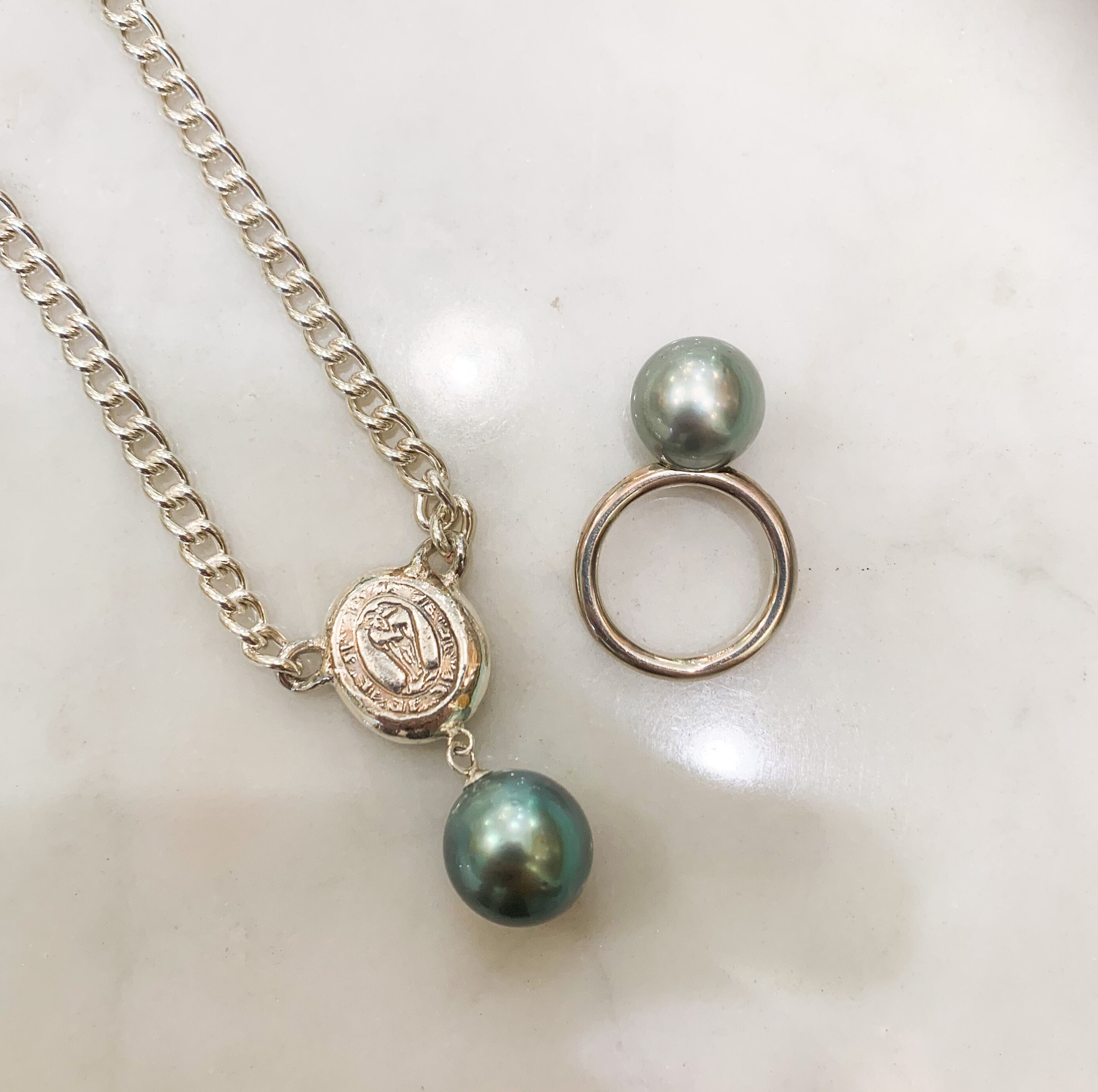 グレーとは言っても、ベタっとしたワントーンのグレーではなく、真珠特有の緑色やピンクなどが混じり合う、美しいグレーです。