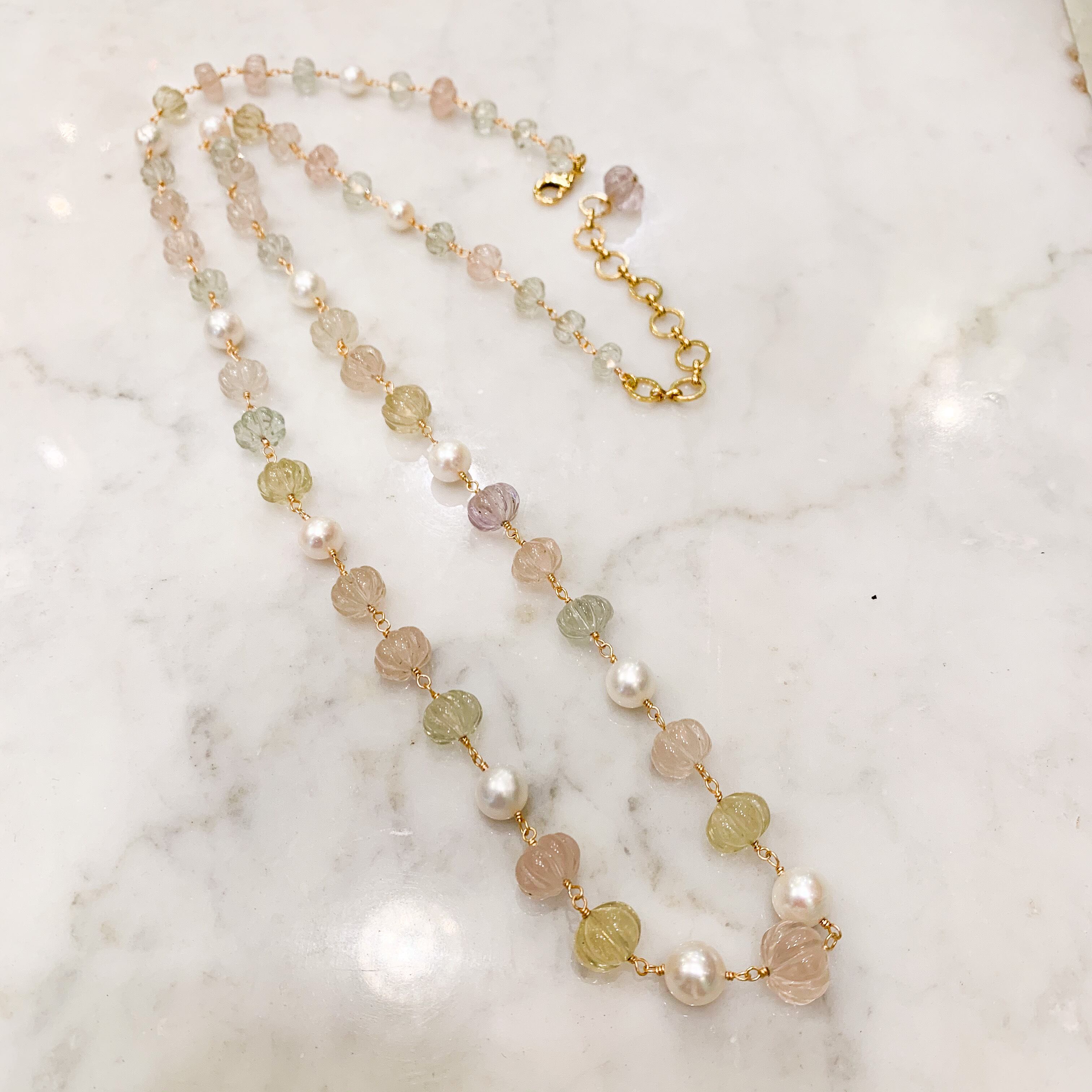淡く優しいトーンの水晶をグラデーションに並べて、ところどころに真珠を混ぜ、金色のワイヤーの眼鏡留めでステーションネックレスにした、ロングネックレスです。